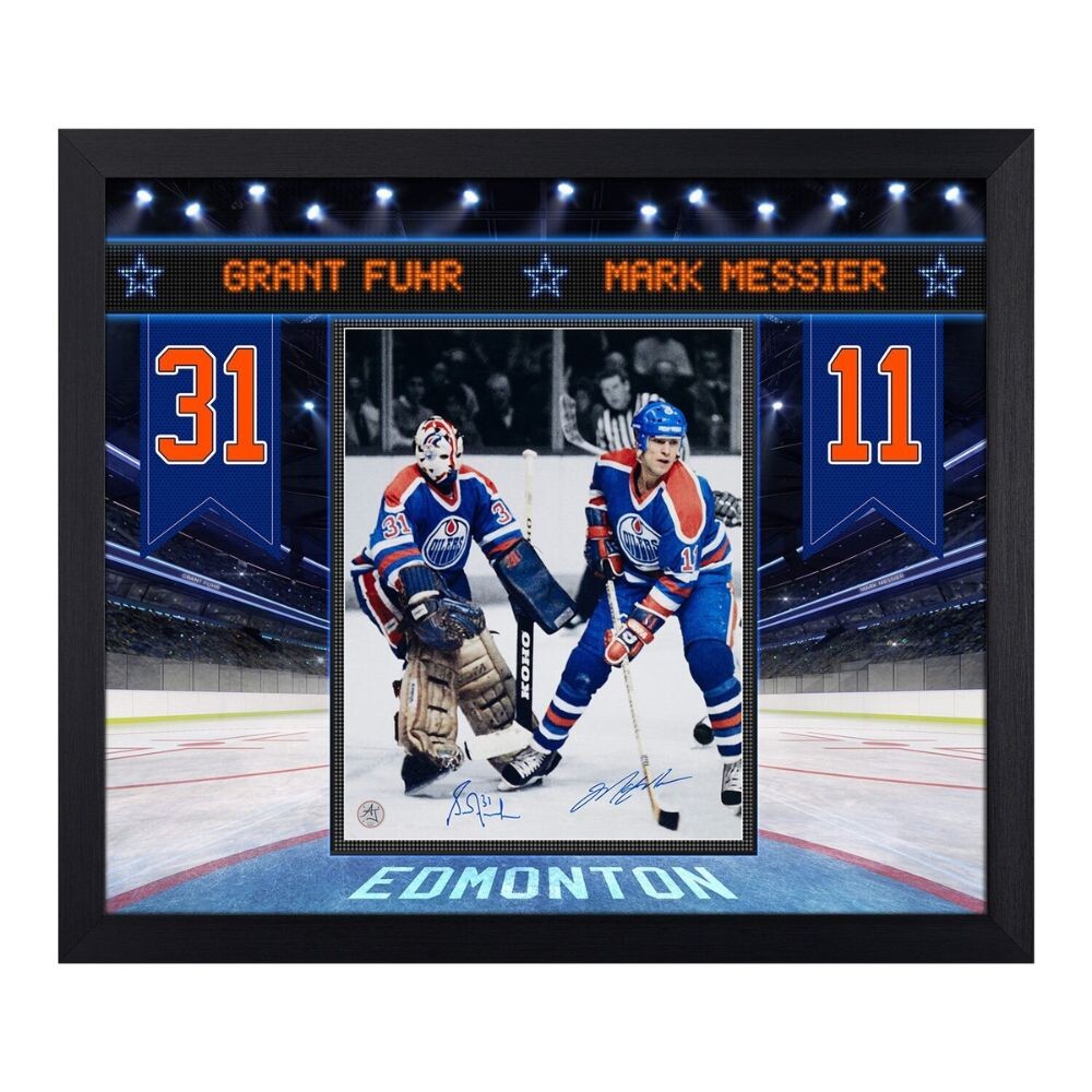 Mark Messierand Grant Fuhr Dual Signed Edmonton Legends 23×27 Frame. Edmonton Oilers DualEdmonton Legends 23×27 Frame. The 11×14 photo in this frame is hand signed by Mark Messier & Grant Fuhr. Custom design features a franchise legends graphic with arena scoreboard and banners. Photograph of Mark Messier & Grant Fuhr as teammates with the Edmonton Oilers.