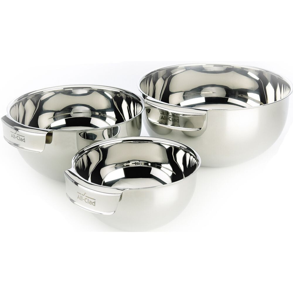 The three sizes offered in the mixing bowl set cover all your needs in the kitchen, from mixing batters and dressings to tossing salads and incorporating dough. Rolled rims facilitate easy pouring. Integrated handle provides for a secure grip, and can be used as a double boiler, with the handle resting over a pan’s edge. Includes 1.5, 3 and 5 quart capacity bowls, which stack for easy storage.