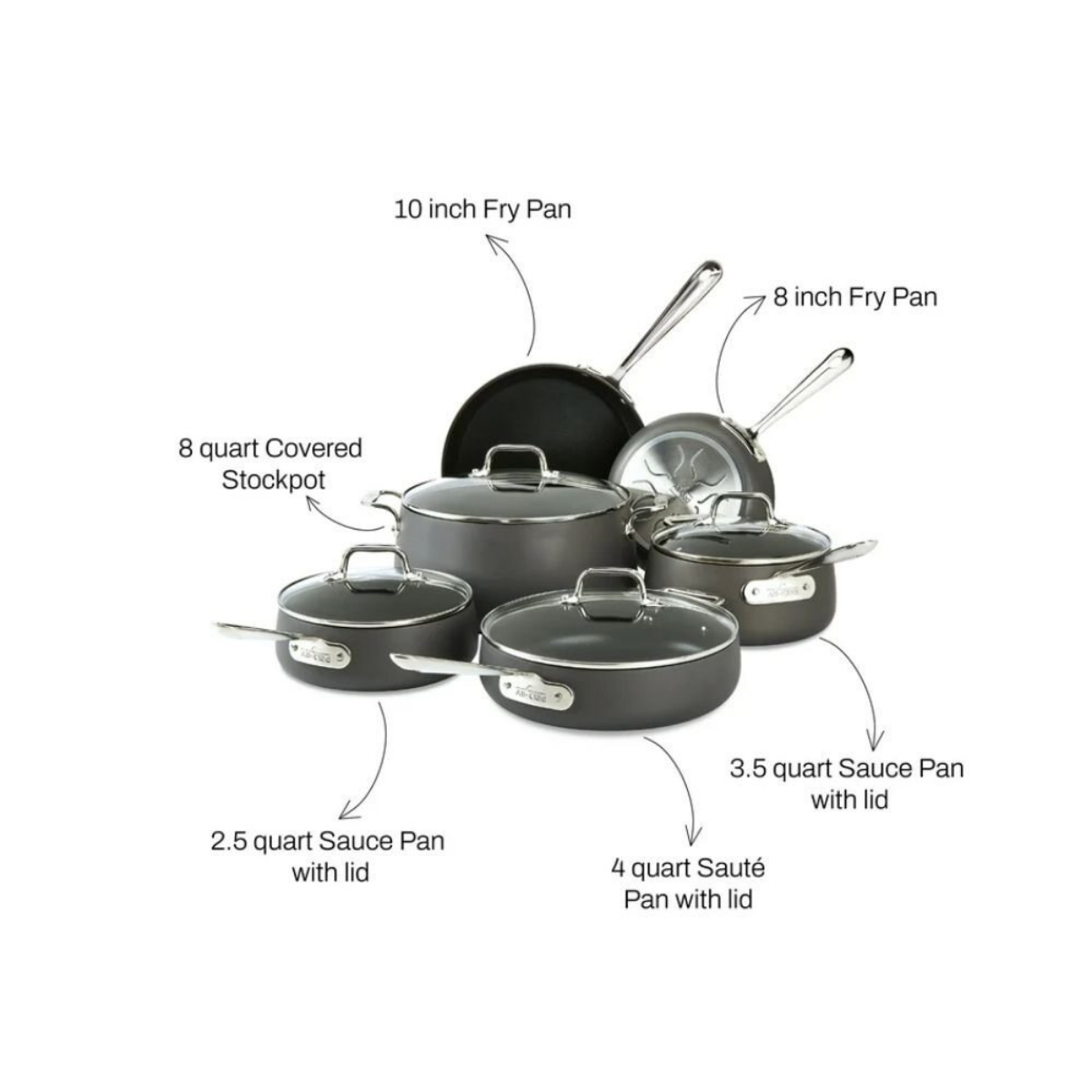 A great introduction to All-Clad, the All-Clad HA1 Hard Anodized E785SC64 10-piece nonstick cookware set includes 8 inch and 10 inch fry pans, 2.5 quart and 3.5 quart sauce pans with lids, a 4 quart sauté pan with lid, and an 8 quart stockpot with lid. With HA1 Hard Anodized cookware, you can experience the renowned quality of All-Clad and the ultimate convenience of nonstick. The All-Clad cookware’s three layers of nonstick coating ensure effortless food release and make cleanup a breeze. Even more, Hard Anodized nonstick cookware offers dishwasher-safe convenience, induction compatibility, and warp-resistant strength. Discover what it means to cook with All-Clad.