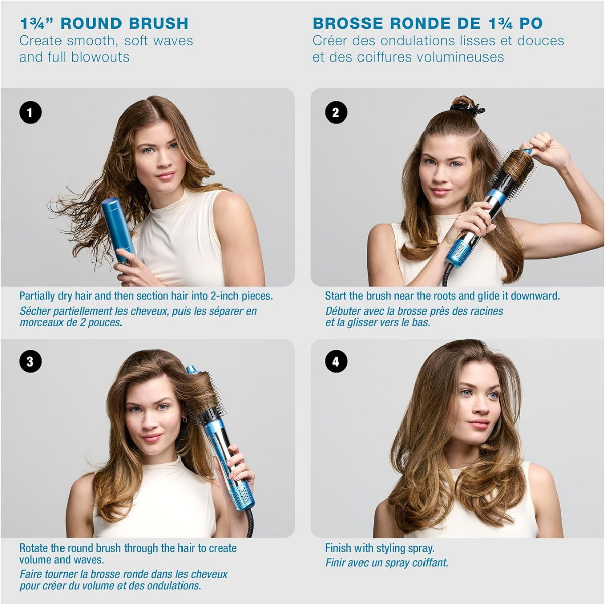 1-3/4″ Round Brush: Perfect for full blowouts and styling your hair in smooth, soft waves, adding volume to your salon-worthy look.