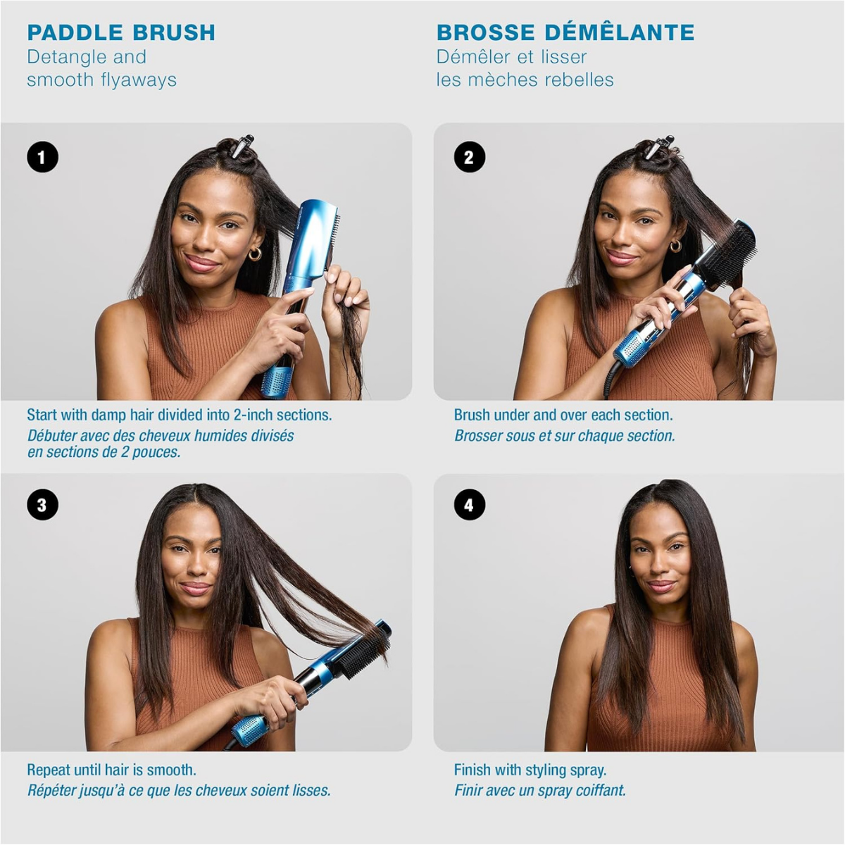 Paddle Brush: Detangle and smooth your hair, getting rid of any flyaways for shiny and smooth finish. Use under and over brushing techniques for optimal results.