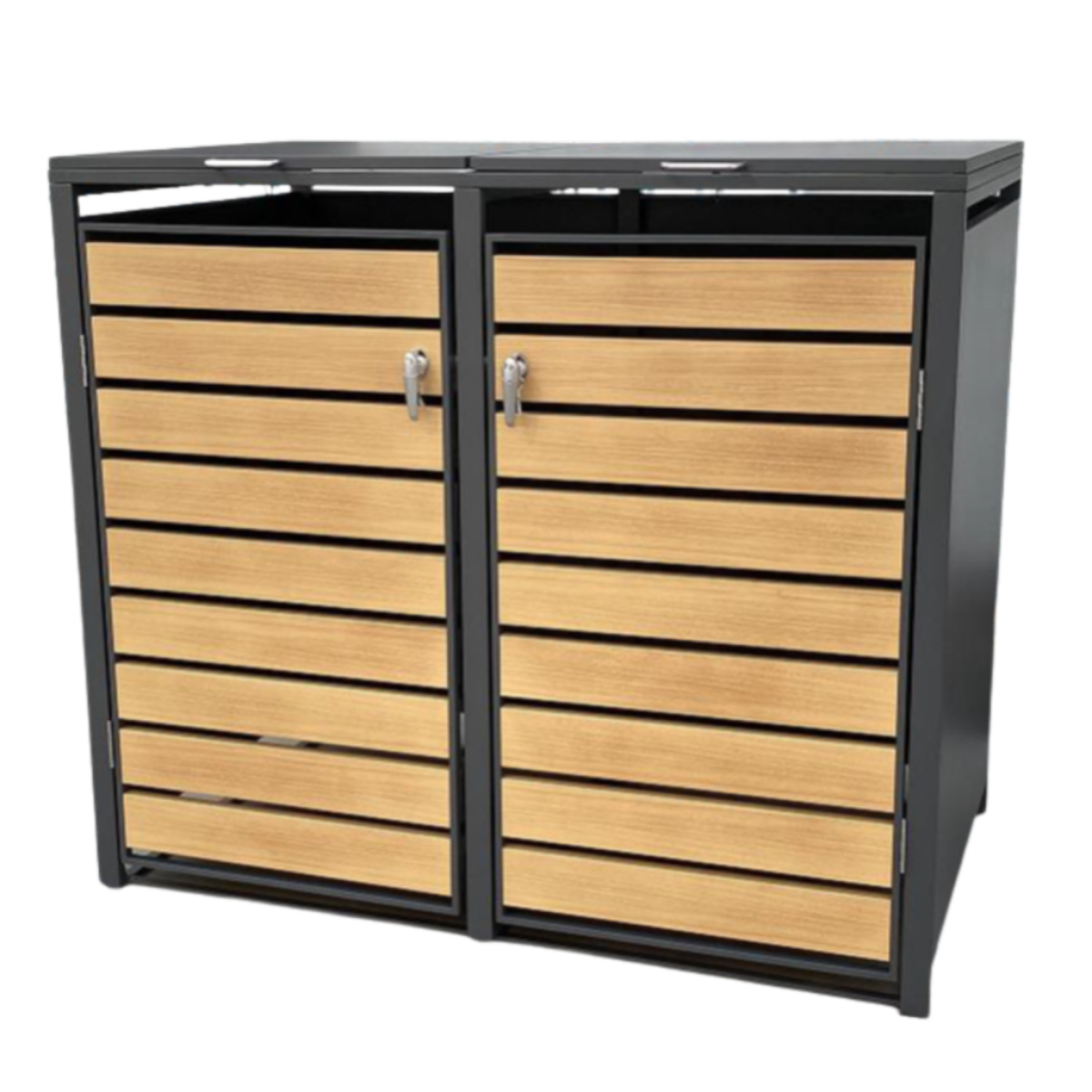 Outdoor steel Refuse Shed designed to fit 2 garbage/recucling bins. Split liftable lid & locking doors. Black with wood-look front.