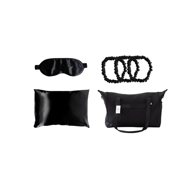 The ultimate bag& bougie travel bundle. Perfect for a much needed getaway! Includes an Organic Silk Pillowcase, eye mask and three hair scrunchies made from organic mulberry silk.