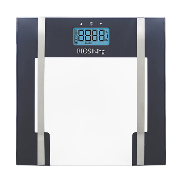 Features: Blue black light LCD display, tempered glass with stainless steel accents, LB/KG/ST switchable, measures: body fat, water percentage, muscle mass, bone body mass index