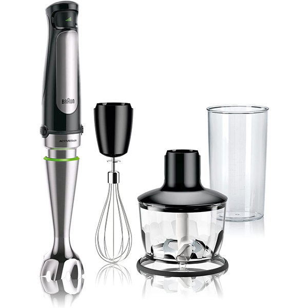 The MultiQuick Hand blender with revolutionary SmartSpeed technology and 400 watts of power opens up a whole new world of cooking possibilities. With just one touch, the more you squeeze, the more speed you get. Braun’s patented PowerBell blending wand system uses ultra-hard stainless steel blades and a unique bell-shaped design to decrease suction and give you faster, more even results. Combined with SplashControl technology, there is virtually no splashing, making cleanup a cinch. Its EasyClick Accessory System makes switching attachments as fast as the click of a button.