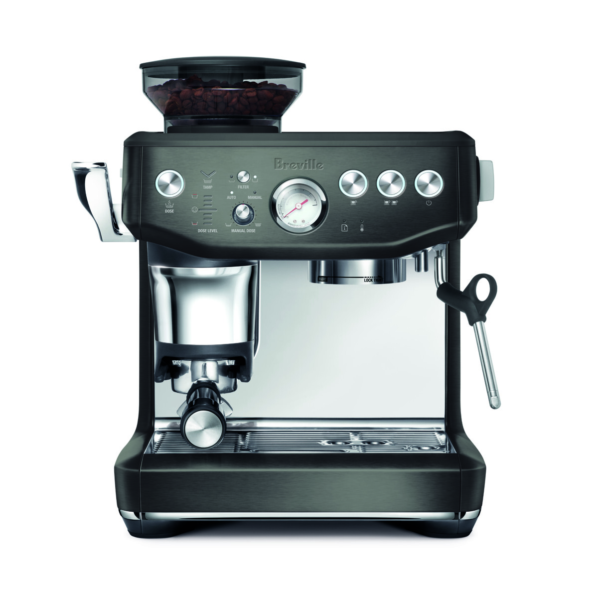 The dose is automatically calculated based on the last grind, ensuring it’s ready for the next use. Assisted tamping Delivers a constant 22lbs impression to your dose, finishing it with a 7° barista twist for a more polished puck. Precision measurement auto corrects the next doseIf your dose requires a bit more or a bit less, the intelligent dose system auto corrects, remembering the last dose and tamp outcome and adjusting it to ensure you achieve the perfect dose this time. 54mm stainless steel portafilter delivers full flavour with dual and single wall filters Full bodied coffee with rich and complex flavours is created using the ideal dose of 18g of freshly ground beans delivered by a professional style 54mm stainless steel portafilter. Low pressure pre-infusion followed by 9 bar extraction An opulent, creamy and caramel coloured espresso starts with low pressure pre-infusions, followed by a high pressure (9 bar) extraction process delivered via our 15 bar Italian pump. Thermocoil heating system delivers 200°F with PID temperature control The Thermocoil heating system with PID temperature control delivers water at exactly 200°F for perfectly balanced flavours. Manual hand-crafted microfoam Our powerful steam wands are designed to quickly turn milk into smooth microfoam with a delicious silky texture, ready for pouring latte art.