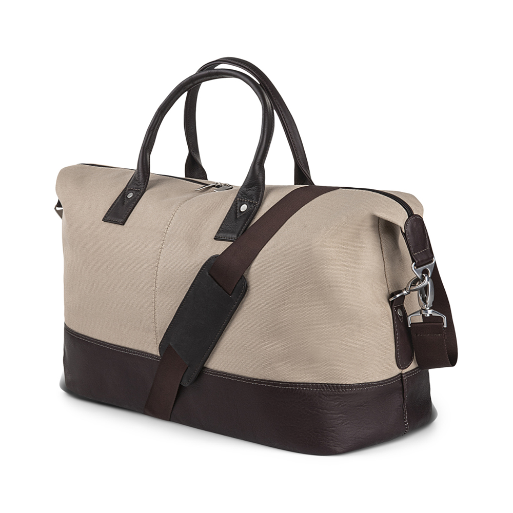 Duffel bag in Canvas and Colombian leather trim nicely decorated with perforated leather panels. You’ll want our Canvas weekender to go everywhere with you! This elegant duffle has a reinforced and comfortable handle that attaches with a snap. It has a removable shoulder strap and well-thought-out interior make it an ideal bag for your weekend getaways.