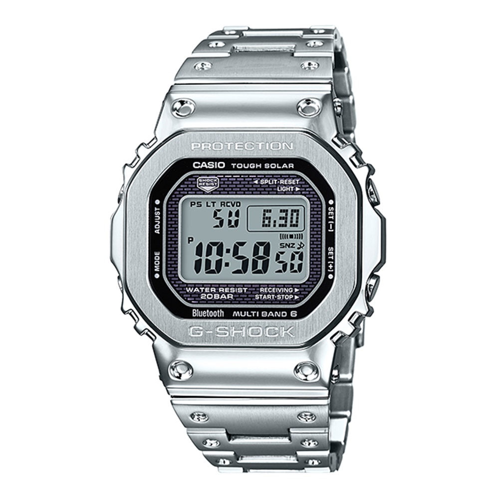 The DW-5000C is the original G-Shock model from 1983. The GMW-B5000 Series has inherited its characteristic square design and been given the full metal treatment along with upgraded features including smartphone linking. The watch has been given a full-metal case by using a shock-resistant fine resin cushioning material inserted between the case and the sturdy stainless steel metal bezel. High-density mounting technology also allows the watch to maintain its size. The back of the watch features a solid Screw Lock Back and has been DLC treated for resistance to wear. The metal band has been dimple processed, inheriting the Resin Band design of the original.