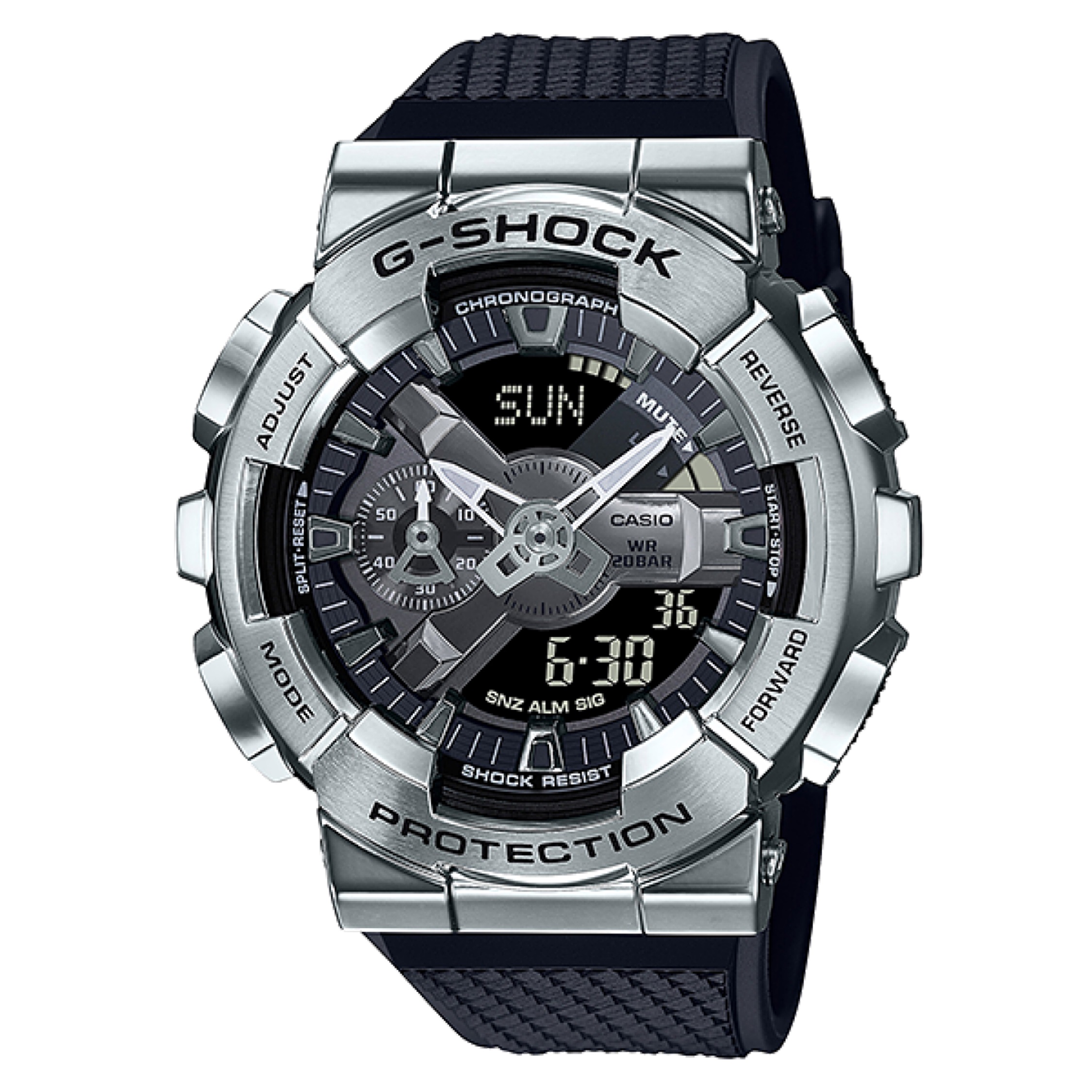 From G-SHOCK, the toughness watches that are ever evolving in an endless pursuit of strength, the GM-110 series is based on the digital-analog display combination GA-110 model of the rigid and fashionable stainless steel bezel. The dial has a characteristic Y-shaped part that retains the texture of the metal, and the digital display and hour and minute hands are arranged in a well balanced manner to improve visibility. The stainless steel bezel of this analog-digital GM110 Series model have been forged, cut and polished to give it its distinctive design. The bezel is crafted with metal material. Minute protrusions on the inner case reduce surface contact with the bezel to cushion shocks to the module. Glass fibers are incorporated into the resin for increased strength. The material’s resistance to breakage and bending protects the module from external shock.