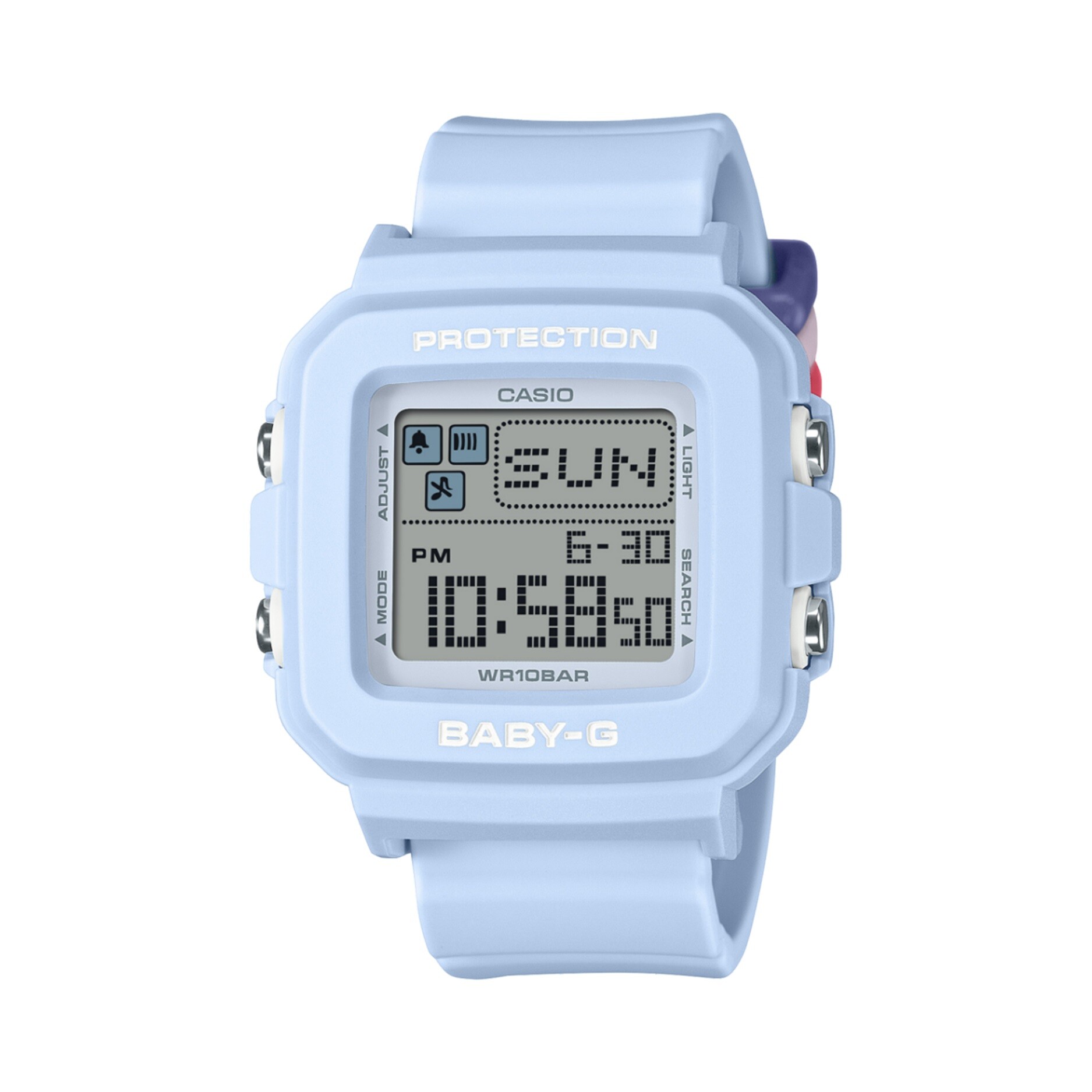 Introducing the BABY-G+PLUS convertible watch, designed for endless customization and fun. This watch features interchangeable band loops, allowing you to mix and match for a unique style every day. It comes with three band loops and a pass-through band, which can be easily removed without any special tools. You can choose from nine included band loops in seven solid colors and two translucent hues, offering a variety of textures and colors to suit your mood and fashion. The watch also includes playful pixel-art animations (surfer, dancer, dolphin, blowfish, dog, cat) that appear when you press the light button in Timekeeping Mode, adding a touch of charm to the watch face. Beyond its fun features, the BGD-10L is practical with shock-resistant construction and 100-meter water resistance, making it both stylish and durable.