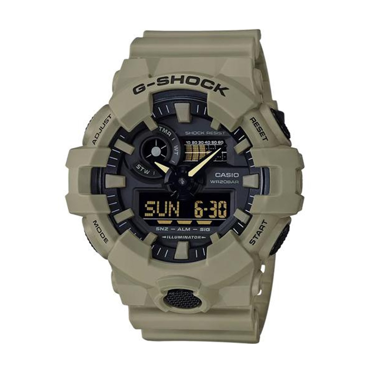 From G-SHOCK, the watch brand that is constantly setting new standards for timekeeping toughness comes the GA-700 Super Matte Finish analog/digital combination model. Inspired by the color palettes found in military uniforms and utility jackets, the new collection sees the GA700 shades to complement the ongoing military color trend.