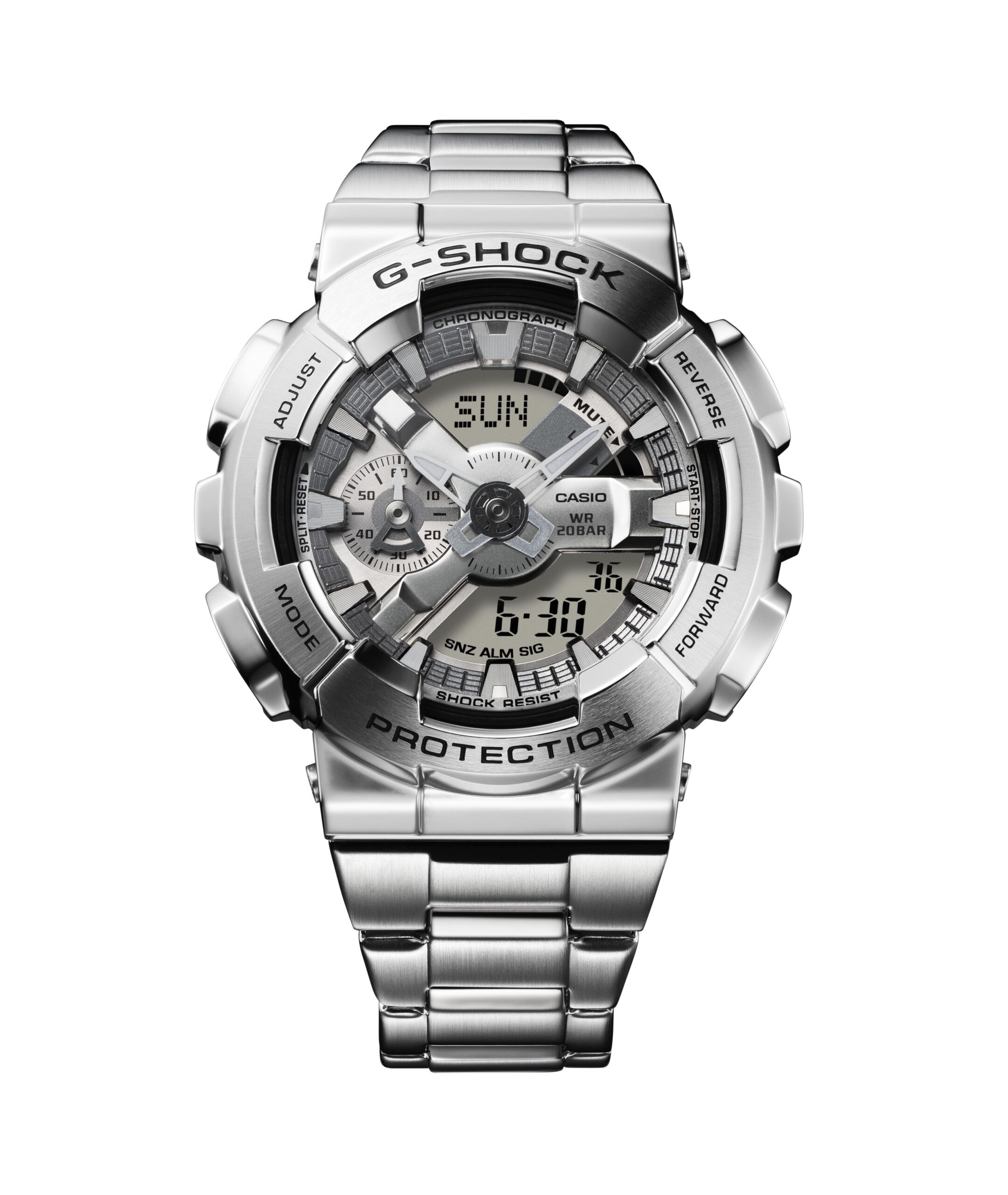 Introducing the GM-110 series from G-SHOCK, designed for those who seek ever-evolving toughness. These watches feature a durable and stylish stainless steel bezel, inspired by the GA-110 model’s digital-analog display combination. The dial includes a distinctive Y-shaped element that showcases the metal’s texture, while the digital display and hour and minute hands are thoughtfully arranged for enhanced visibility.