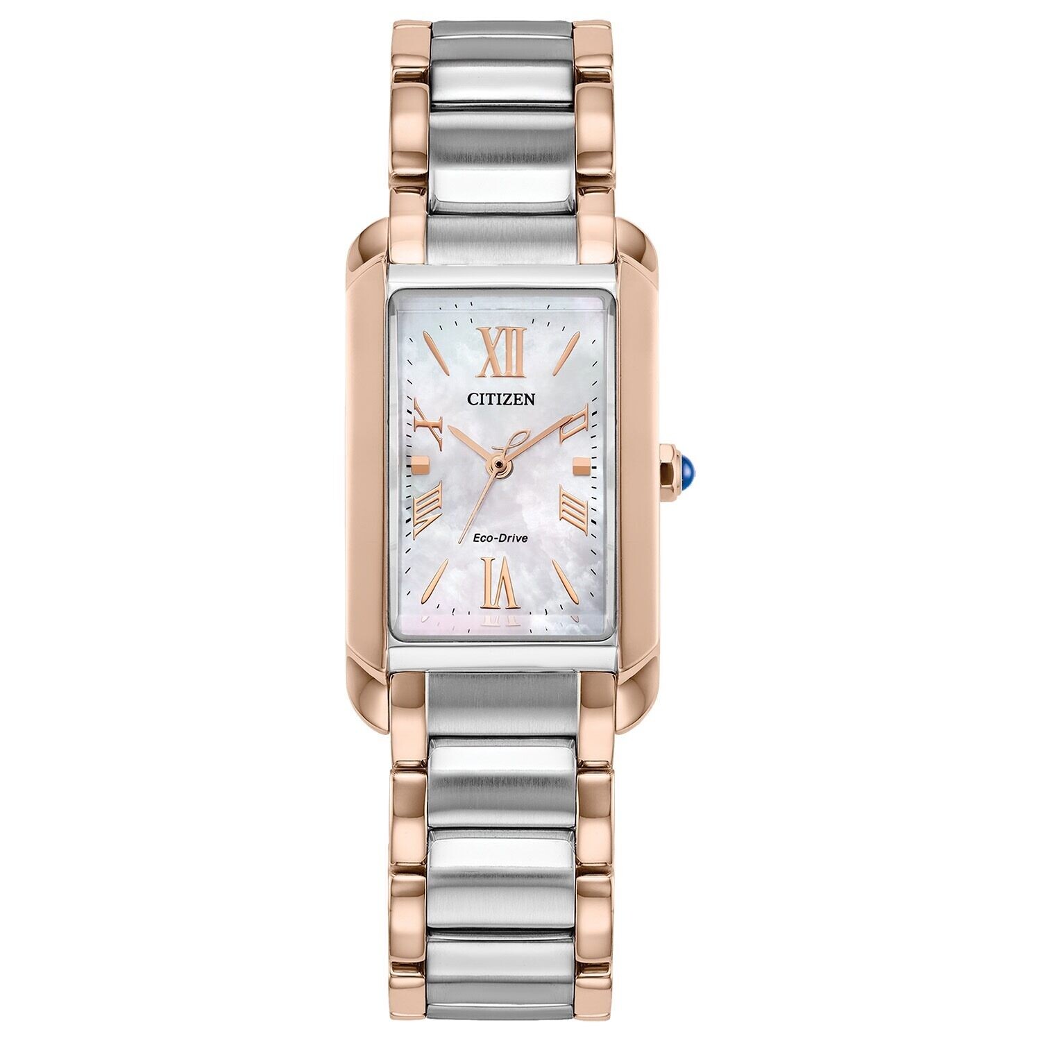 Citizen Bianca. The Bianca collection represents the epitome of a ladies’ timepiece, showcasing all the sophistication, style and power that appeal to today’s woman. The simplicity of the case is partnered with an elegant pink dial with a curved sapphire crystal. Featured here in two-tone gold-tone stainless steel. Foldover clasp with prush buttons. Featuring our Eco-Drive technology – powered by light, any light. Never needs a battery. Case Diameter 32mm x 30 mm. Water Resistance 0050M.