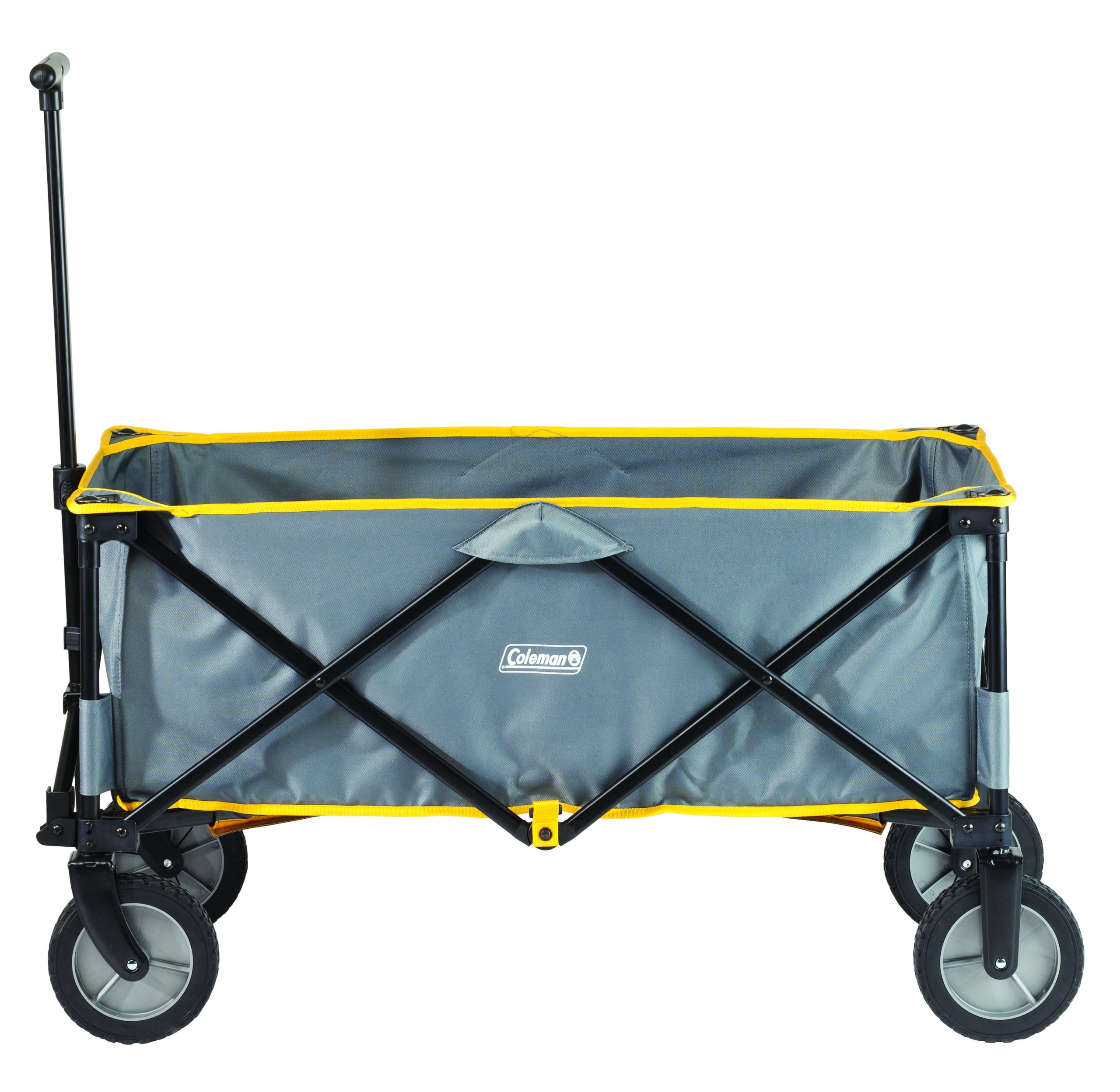 Lugging your gear to the campsite is even easier with the Coleman Camp Wagon. This durable, rugged wagon has 5 cu. ft. of carrying space, perfect for transporting sleeping bags, coolers, sports equipment and even your tent. Tough, heavy-duty polyester fabric, a removable, reinforced bottom and a steel frame provide reliable hauling season after season. The handle connects directly to the axle, giving you superior control. After everything is unpacked, the wagon folds up accordion-style and fits into the included carry case.