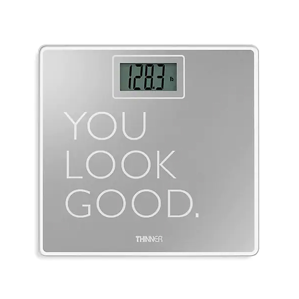 The Thinner by Conair Digital Phrase Glass Scale is perfect for any bathroom décor. Metallic Silver finish, with a touch of inspiration combined with a clean design and multiple load cell technology for extreme weight accuracy.