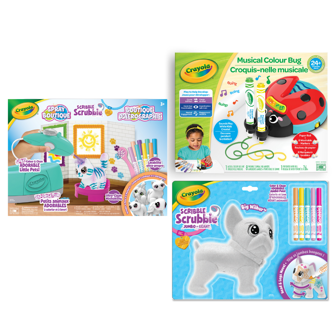 Crayola® Scribble Scrubbie™ Pets! offers endless transformation; allowing kids to customize their pets with markers then wash them & begin again! Now, kids can nurture, customize and transform and play with these pets using the new airbrush in a spray boutique environment!