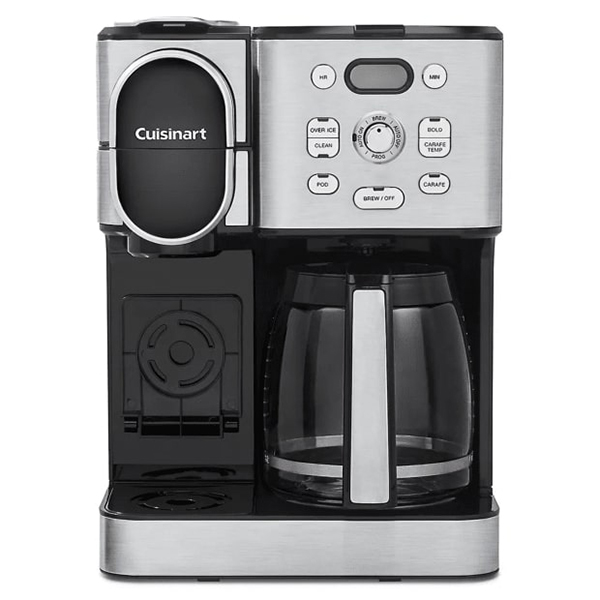 Drip or pod, hot or iced, single cup or carafe for 12—get your coffee, your way with the Cuisinart 2-in-1 Coffeemaker. This kitchen essential for coffee lovers takes home brewing to another level by combining 12-cup carafe and single-serve options in one convenient unit. Brew a full pot 25% faster with Extreme Brew technology. Customize when and how you want your coffee with advanced start, Brew Pause™, temperature control, auto-off, and bold flavor settings. Instantly brew a single serving of hot coffee in 5 cup sizes with any pod, including Keurig K-Cup®, or the reusable HomeBarista™ filter. Or brew over ice for delicious coffee that refreshes! Experience complete brewing versatility and customizable convenience, courtesy of Cuisinart!