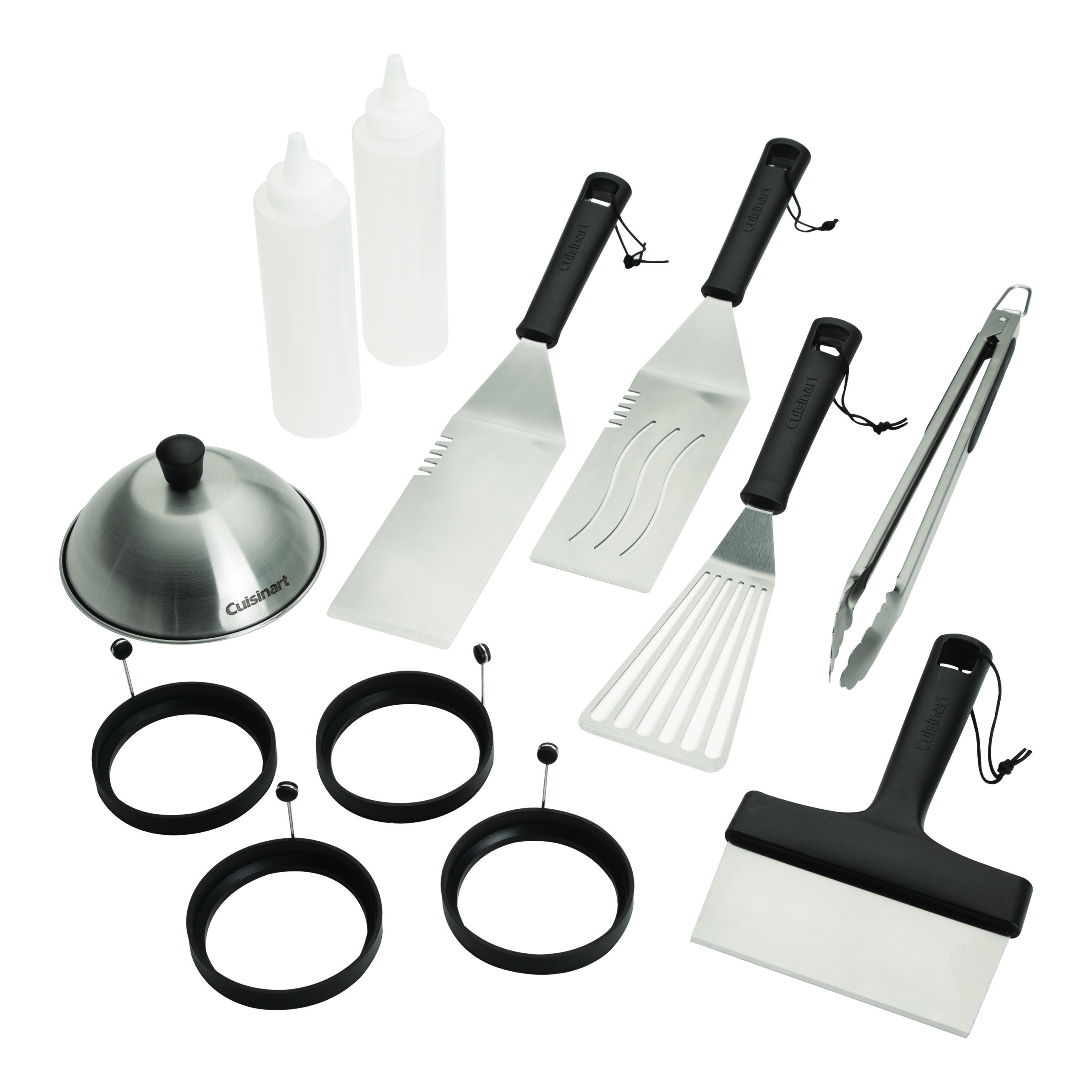 The Cuisinart 12 Piece Griddle Set provides you with everything you need to master the griddle! This comprehensive set features 2 griddle spatulas, a flexible spatula, locking tongs, multi-purpose scraper, 6″ melting dome, 2 squirt bottles, and 4 silicone egg rings. The griddle spatulas include one solid and one perforated spatula for handling anything you throw on the griddle. The perforated design allows for excess grease to drip through for healthier cooking. The flexible spatula is ideal for more delicate food like seafood, eggs, pancakes, or veggies. Use the multi-purpose scraper for quick chopping on the griddle surface or a quick cleaning in between rounds of food. The 4 silicone eggs rings will help you create perfectly shaped eggs for bacon and eggs or egg sandwiches and the non-stick material easily slides off, keeping your eggs in tact. The 6″ melting dome is ideal for melting cheese on burgers or concentrating heat to speed up cook times. What griddle set is complete with out squirt bottles? The translucent bottle are ideal for keeping water and oil handy while griddling.
