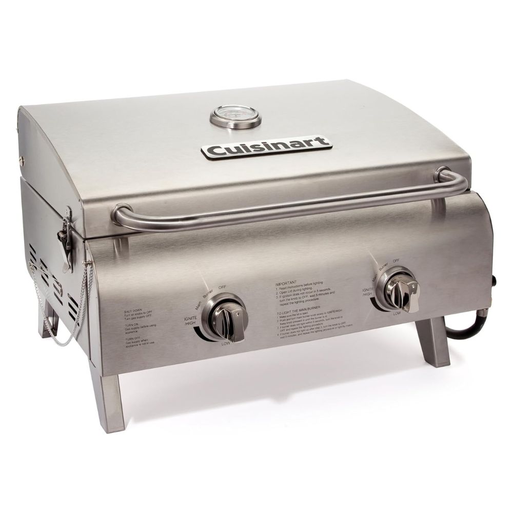 The Cuisinart Chef’s Style Tabletop Grill delivers the performance of a full-sized grill with the convenience of portability. This grill fires up 20,000 BTUs of meat-searing heat across 275 square inches of cooking space. With all of that power comes much control as well. Two independently controlled burners allow you to set different heat zones to cook all your barbeque foods, and the built-in thermometer monitors the grill temperature. The stainless finish will look as good at home as on the road.