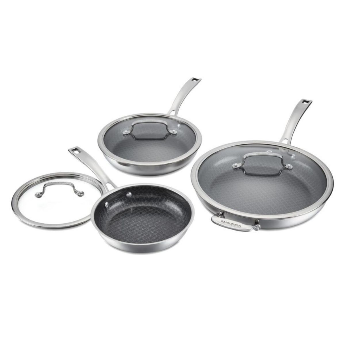 Elevate your everyday cooking with the Cuisinart® FusionPlus Nonstick Stainless Steel 6-Piece Cookware Set. The 6-piece stainless steel cookware set features professional stainless steel construction, polished exterior finish, and aluminum-encapsulated base for even heating, letting you fry, brown, and sear like a professional. Cool Grip™ handles stay cool to the touch, and the pan set is both dishwasher and oven safe up to 500°F (lids 450°F).