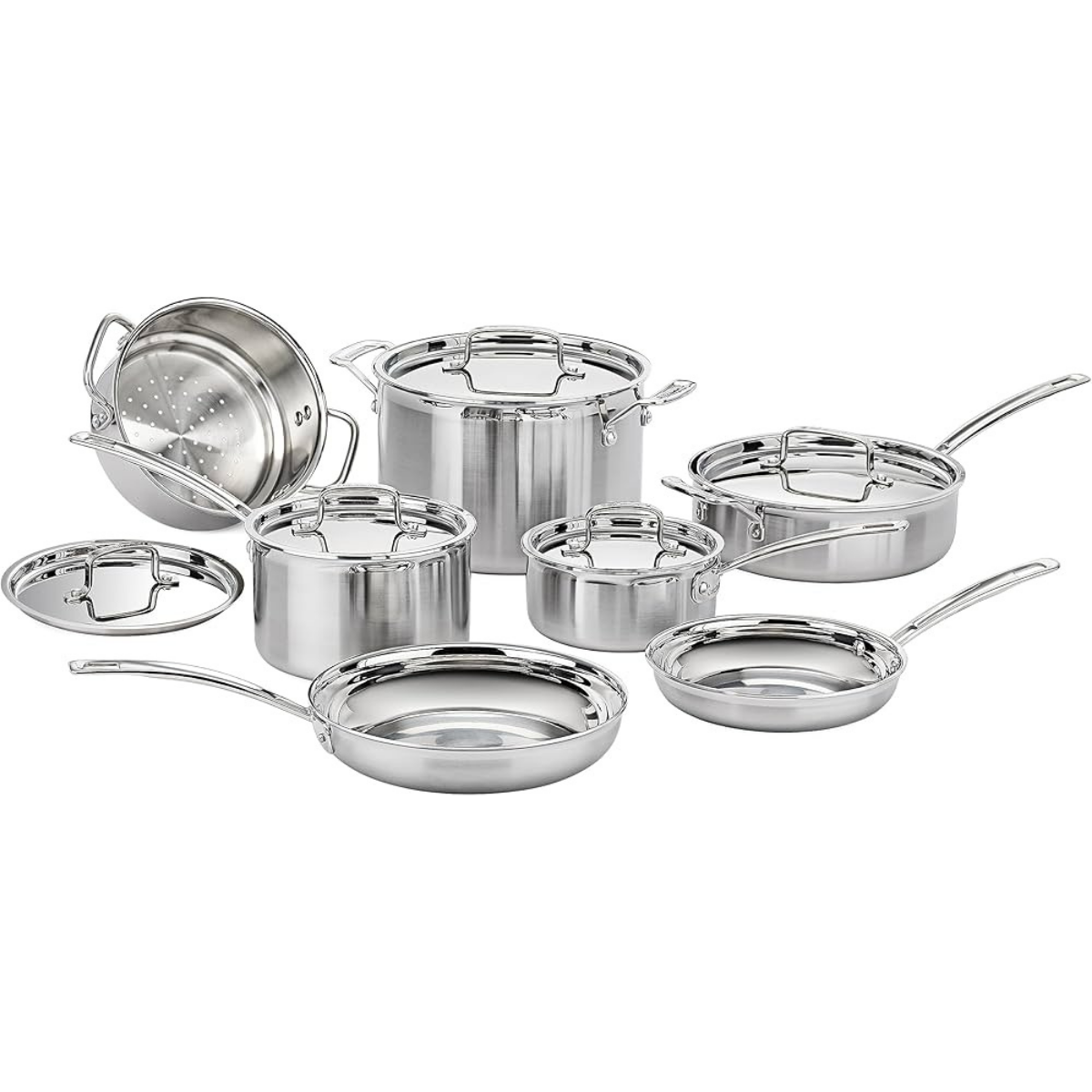 Triple Ply Stainless steel construction provides the optimal heat conduction. This excellent cookware set is perfect for classic cooking techniques like slow simmers, rolling boils, and liquid reductions. Stainless steel makes an ideal cooking surface because it does not become discoloured, react with food, or alter flavours. Set includes: 1.5 Qt. (1.4 L) Saucepan with Cover, 3 Qt. (2.8 L) Saucepan with Cover, 3.5 Qt (3.3 L) Sauté pan with helper handle and cover, 8 Qt (7.6L) Stockpot with Cover, 10 inch (24 cm) Skillet, 8 inch (20 cm) Skillet, and 8 inch (20 cm) Steamer Insert with cover.