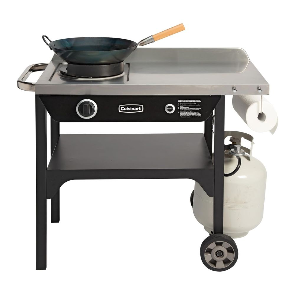 Wok This Way! Create fast, fresh and fabulous meals in minutes with the new Cuisinart Outdoor Wok Station. Premium features and unparalleled performance, it’s time to take your outdoor culinary skills to new heights. The first and only cooking solution bringing indoor wok cooking outside. Complete with premium 14” hand-hammered carbon steel wok, powerful 50,000 BTU burner system and precision haptic knob sensory control. Designed for ease of use, the Outdoor Wok Station features large rear wheels for mobility, an integrated 20 lb. propane tank holder, a convenient paper towel holder, generous prep area, and easy-clean stainless-steel top. Don’t just cook it…Wok it!