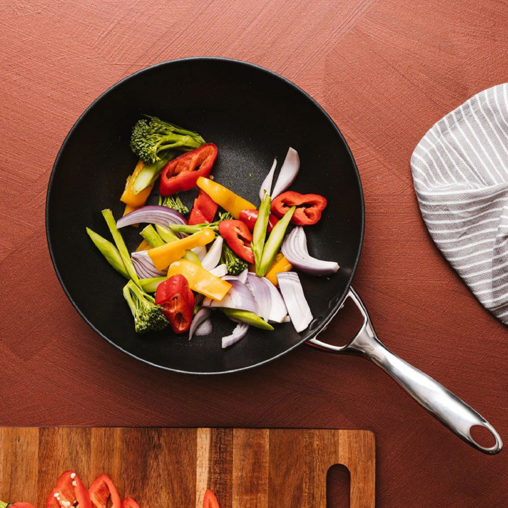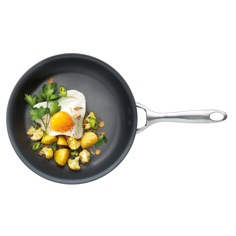 Get cooking with the Cuisine::pro® iD3® Hard Anodised Frypan 26cm. The pan has been hard anodised to create a super tough warp free surface and body, resulting in a pan that is twice as hard as stainless steel. The pan promotes rapid heat transfer and efficient heat distribution for even cooking, eliminating hot spots and burning in the pans interior corners. The interior and exterior features a tough TRI-TEC triple layer non-stick, providing quick easy cooking, long lasting food release and faster clean up. The TRI-TEC triple layer is perfect for low fat cooking as you can use less oil. The Cuisine::pro® iD3® Hard Anodised Frypan includes a magnetic stainless steel induction plate making the iD3® suitable for all cooktops. The pan offers the convenience of quick and easy clean up that literally rinses and wipes clean but is also dishwasher safe.