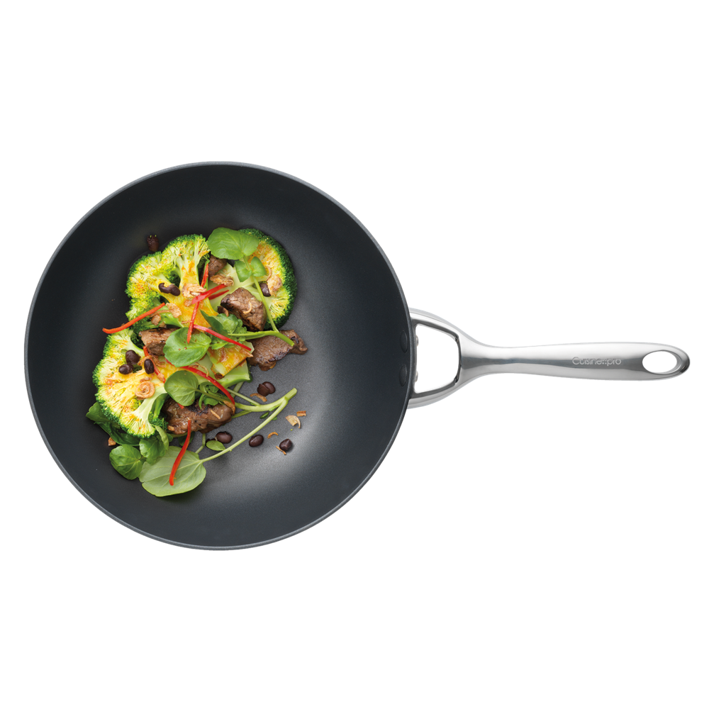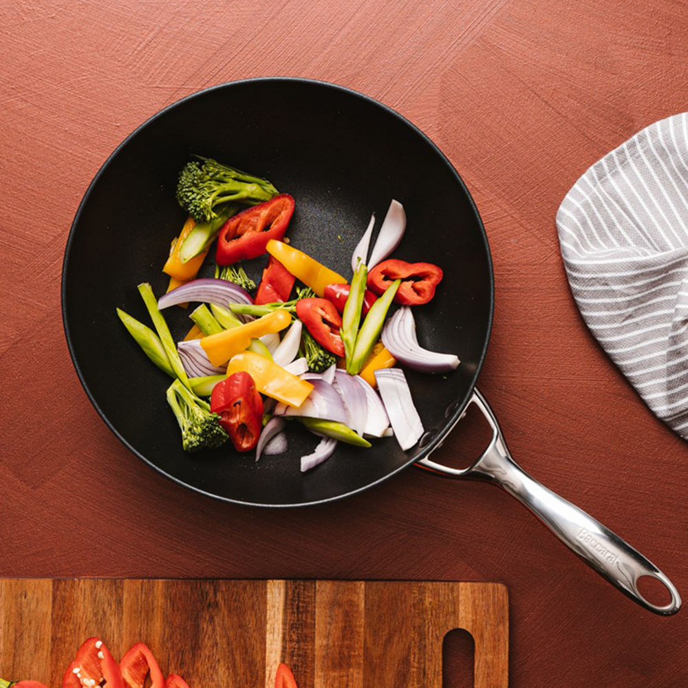 Get cooking with the Cuisine::pro® iD3® Hard Anodised Stir Fry Pan 28cm. The pan has been hard anodised to create a super tough warp free surface and body, resulting in a pan that is twice as hard as stainless steel. The pan promotes rapid heat transfer and efficient heat distribution for even cooking, eliminating hot spots and burning in the pans interior corners. The interior and exterior features a tough TRI-TEC triple layer non-stick, providing quick easy cooking, long lasting food release and faster clean up. The TRI-TEC triple layer is perfect for low fat cooking as you can use less oil. The Cuisine::pro® iD3® Hard Anodised Stir Fry Pan 28cm includes a magnetic stainless steel induction plate making the iD3® suitable for all cooktops. The pan offers the convenience of quick and easy clean up that literally rinses and wipes clean but is also dishwasher safe.