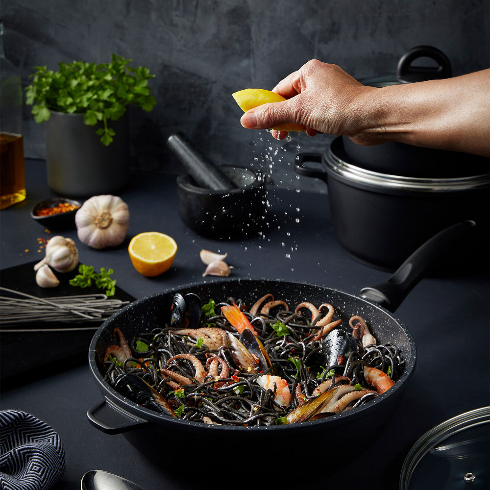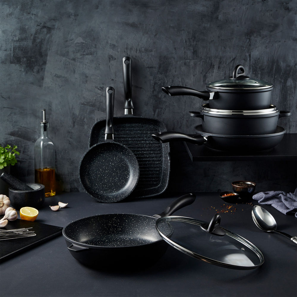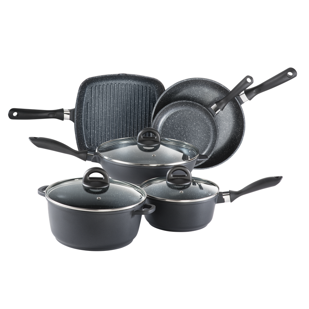 The Cuisine::pro® STONE™ 9 Piece Cookware Set will help you create your dream kitchen. Whether you’re grilling fish, seafood, and vegetables for a romantic date night or creating a delicious pasta dish for a cozy night in, this set has you covered in every culinary scenario. Featuring all your favourite kitchen all-rounders, each piece delivers a combination of value and supreme quality, with a non-stick surface to ensure your cooking process runs as smoothly as possible. The unique STONE™ non-stick coating is environmentally friendly, PFOA pollution free and provides easy-to-clean food release for your convenience. The body of this superior cookware distributes heat effectively and evenly, reducing cooking times and saving energy. It’s fantastic for searing, roasting, boiling, and more. Cuisine::pro®’s STONE™ Cookware Set allows you to easily monitor your food while it cooks, allowing you to avoid overcooking and achieve delicious results every time! This essentials collection has proven to be a favourite amongst budding home cooks and professional chefs alike. Completing your cookware collection and getting inspired in the kitchen has never been simpler.