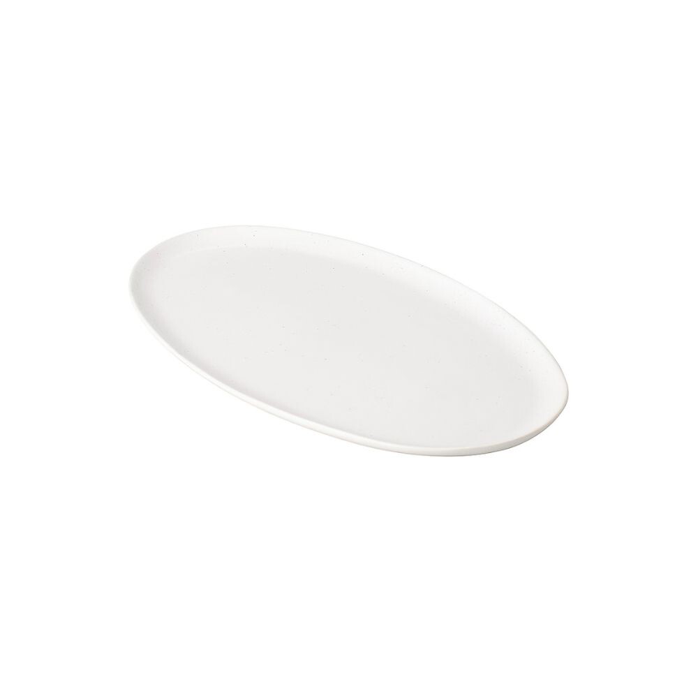 This oval dish offers a superior way to serve, thanks to its long and slender design that enhances any presentation while conserving space. It also serves as a stylish decorative tray for a coffee table or credenza. Each plate is uniquely shaped and hand-finished in Portugal, sold individually. The stoneware features natural flecks that emerge during firing, which may be visible through lighter glazes, resulting in slight variations.