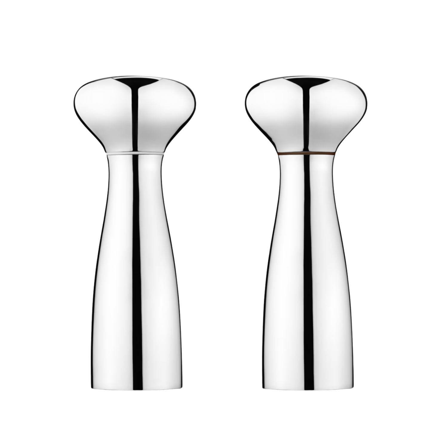 This handsome salt and pepper set is a masterclass in minimal restraint. All unnecessary decoration has been removed leaving just the beautiful organic shape rendered in high shine stainless steel. Form and function are in perfect equilibrium as the shakers work ergonomically in the hand and the adjustable ‘All-Grind – Ceramic technology’ used in the mechanism creates the perfect grain size.