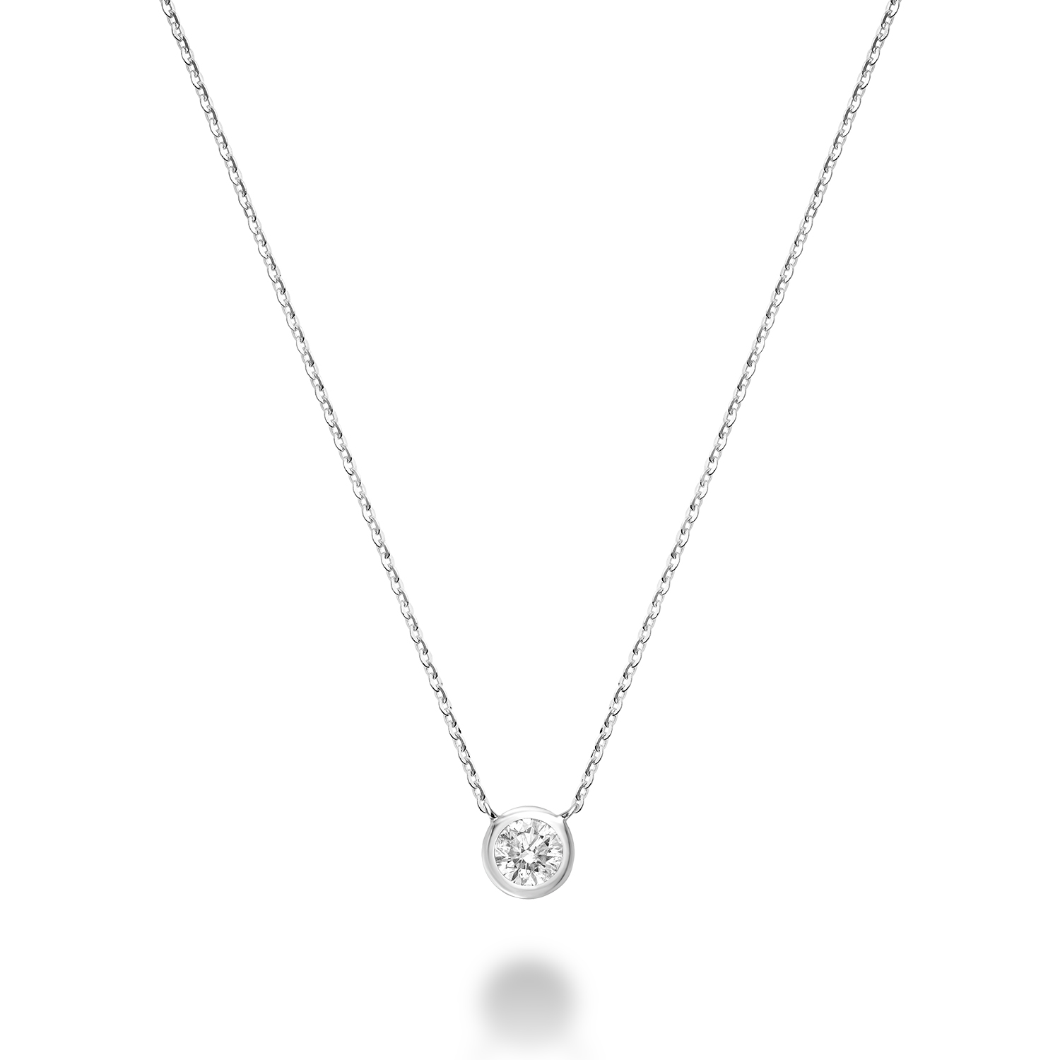 The iconic bezel set necklace, a timeless piece that belongs in any women’s jewellery box! This timeless 14k round brilliant diamond bezel set is fixed on an 16″-18″ dainty 14k chain. The necklace is hand set in 14k white gold with a total approximate carat weight equalling 0.25ct. The necklace consists of 1 hand set stone encase in a thin gold rim. This style is the most versatile necklace in the jewellery box. Can be dressed up or down depending on the occasion. Perfect for layering! Limited One Year Manufacturers Warranty. Clarity: SI/I, Color: G/H.