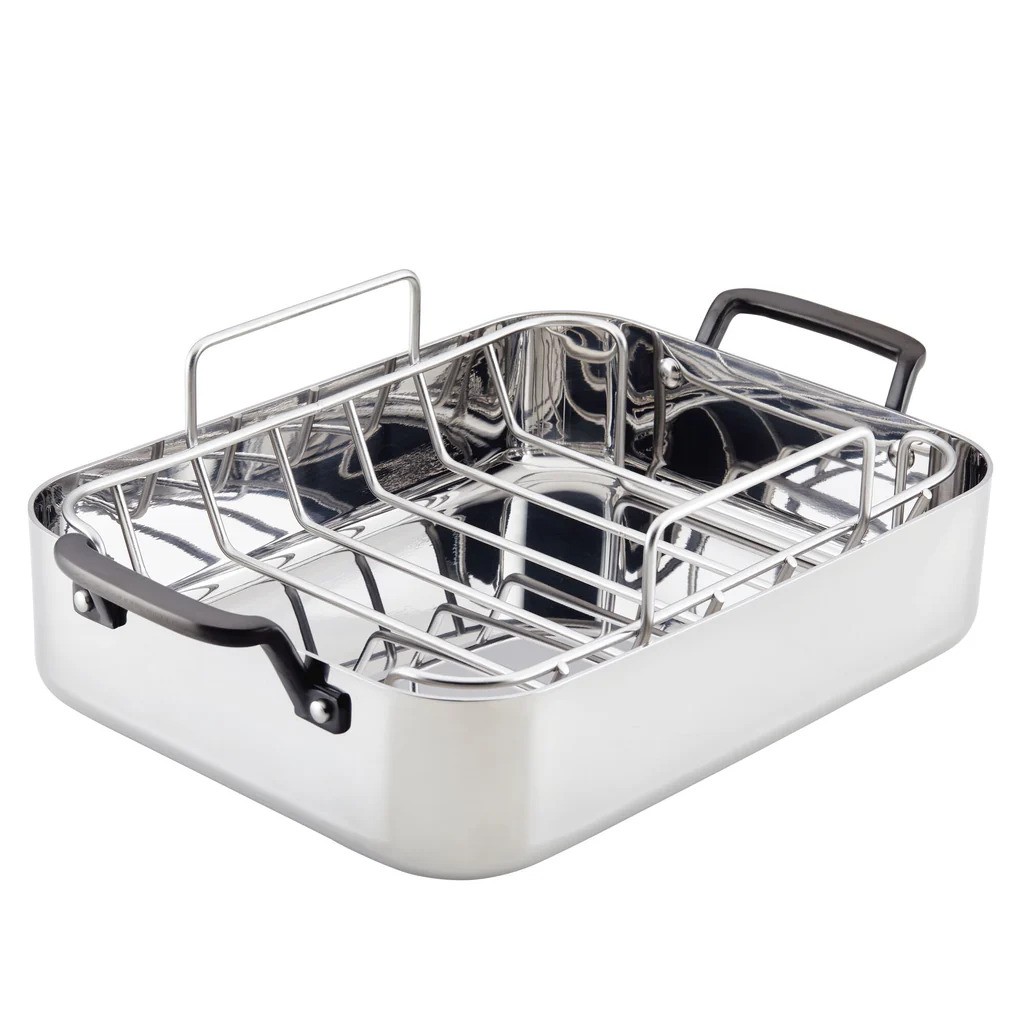 Build layers of flavour while elevating meats to their full potential with the KitchenAid 5-Ply Clad Stainless Steel Roaster with Removable Rack. Crafted from premium clad construction, this stainless steel and aluminum pan delivers even heat and exceptional browning with rack that elevates foods to circulate heat below the turkey, prime rib, or rack of lamb. The durable 5-ply clad pan offers lasting performance with unique black handles and beautiful polished stainless steel exterior for a timeless design. The thick aluminum core delivers superior heat distribution for searing and deglazing on the stovetop, while the pan and rack are oven safe to 500°F for full roasting versatility.