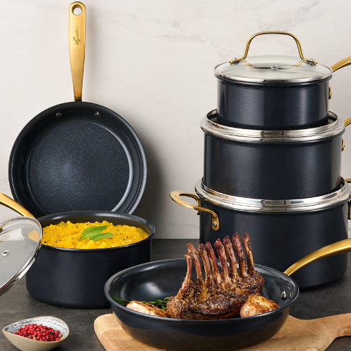 Discover the Lagostina Eleganza Ceramic Cookware, a 10-piece collection that blends exquisite design with culinary innovation. Engineered with a 2-coat advanced ceramic non-stick interior, it ensures effortless cooking and cleanup, free from PFOA and PTFE. The sleek black metallic surface resists stains and facilitates food release with minimal oil, promoting healthier meals. With a ceramic coating 20 times harder than traditional non-stick, it allows the cookware to withstand higher temperatures. Crafted with a thick aluminum body, this cookware heats up swiftly and distributes heat evenly for superior cooking results, complemented by stay-cool gold stainless steel handles for a secure grip. Oven safe up to 450°F/ 232°C, it features a solid induction base for compatibility across all cooktops, exuding elegance in every detail.