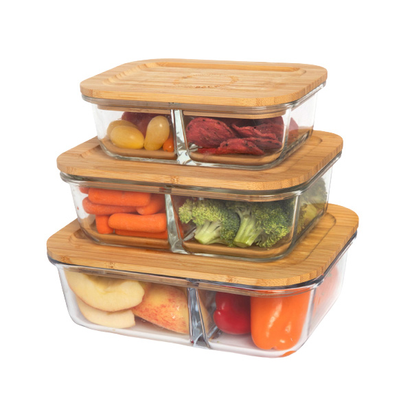 Life Without Waste Divided Glass 3 Piece Container Set with Bamboo Lid