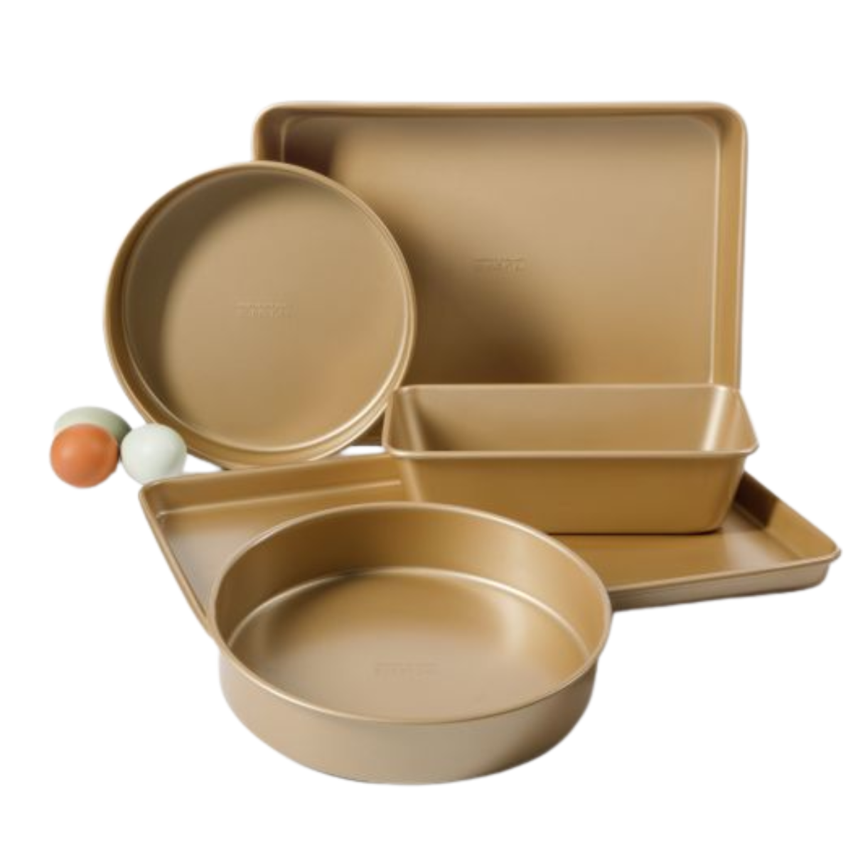 Elevate your baking experience with the Bakeaway 5-Piece Bakeware Set in stunning Champagne Gold. Crafted from durable 0.6 mm carbon steel, each piece features a premium nonstick coating for effortless release and easy cleaning. Perfectly sized for everyday baking, this versatile set includes essential pieces for cakes, muffins, and more. Designed for reliability and style, it comes complete with a factory box and room for storage, making it a perfect addition to any kitchen. Bake with confidence and add a touch of luxury to your culinary creations!
