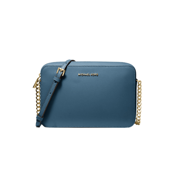Saffiano leather cross body bag featuring a chain and leather shoulder strap, top zip closure, front logo lettering, logo jacquard lining, three inner open pockets.