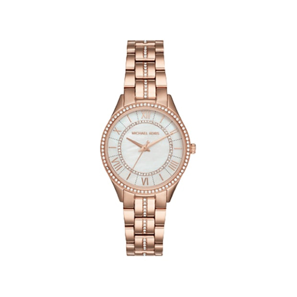 Our mini Lauryn watch boasts a pearlescent dial detailed with drops of pavé and Roman numeral indexes. The rose gold-tone bracelet strap is complemented by sparkling crystals for a brilliant effect. Let it punctuate any look with everyday glamour.