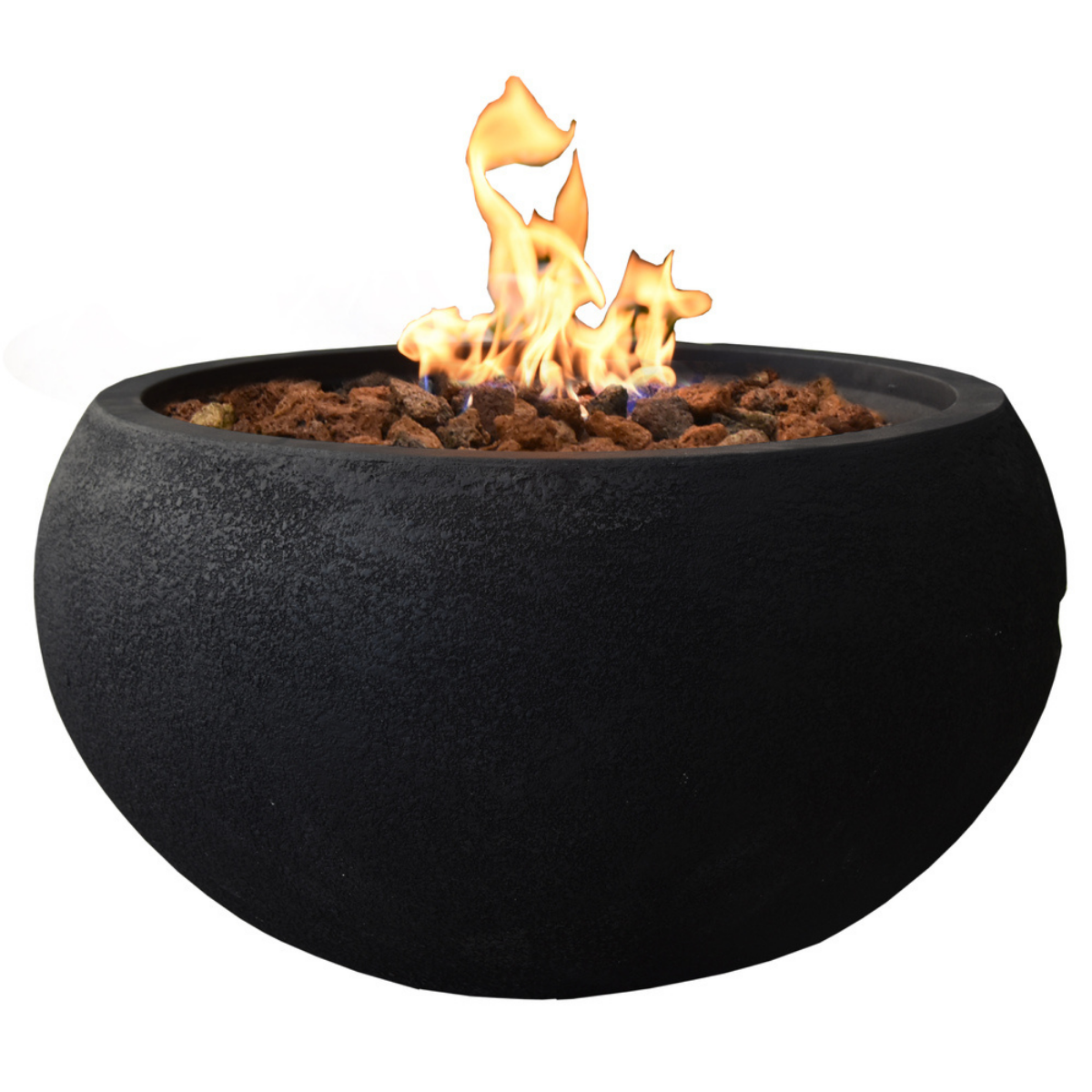 The Modeno York fire table features a glass-fiber reinforced concrete smooth finish in black. The table is easy to set up with a pre-attached 10-ft hose with a regulator for connection to a propane tank.