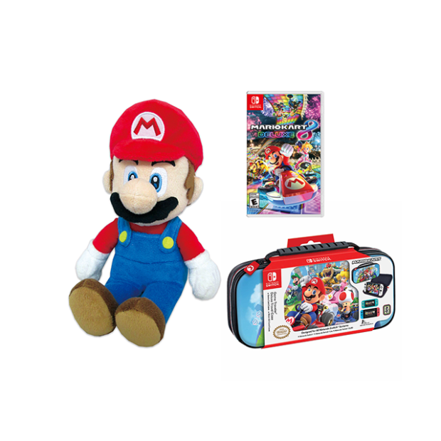 Mario Kart 8 Deluxe Switch. Race and battle your friends in the definitive version of Mario Kart 8. Hit the road with the definitive version of Mario Kart 8 and play anytime, anywhere! Race your friends or battle them in a revised battle mode on new and returning battle courses. Play locally in up to 4-player multiplayer in 1080p while playing in TV Mode. Every track from the Wii U version, including DLC, makes a glorious return. Plus, the Inklings appear as all-new guest characters, along with returning favorites, such as King Boo, Dry Bones, and Bowser Jr! Mario 10″ Plush, Loveable plush toys – it’s like they jumped right out of your favorite videogame! Game Traveler Case Bundle – Mario Kart, Hard shell case protects Nintendo Switch™, Nintendo Switch™ Lite or Nintendo Switch™ OLED Model Systems. Viewing Stand easily adjusts to your desired viewing angle. Recessed bottom insert firmly holds either Nintendo Switch™ or Nintendo Switch™ OLED Model with or without licensed Joy-Con™ Action Grips or Nintendo Switch™ Lite System with or without Protective Glove. Comfortable carrying handle.