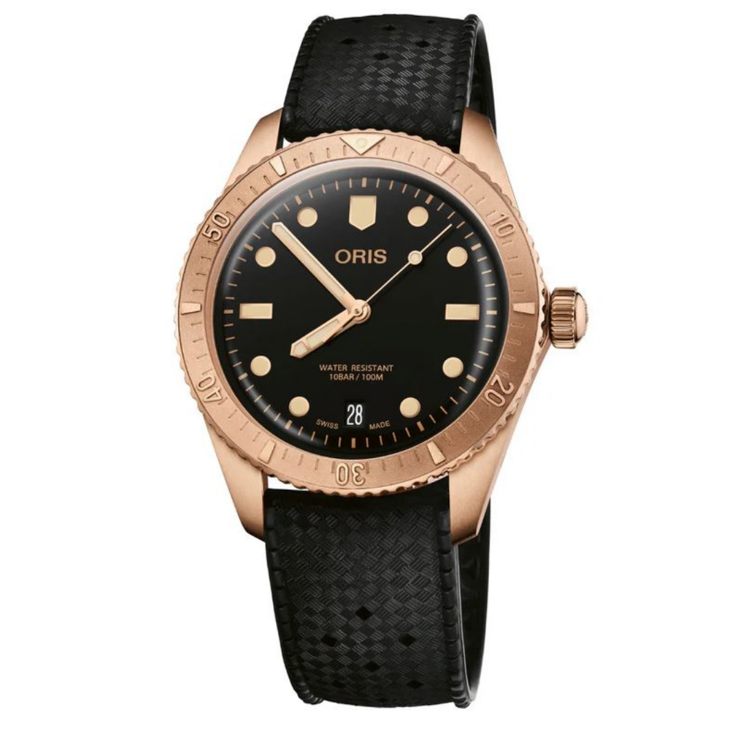 The Divers Sixty-Five Cotton Candy Sepia is back with a bronze case, black dial, golden-edged hands, and hour markers. It comes with a black rubber strap, giving it a warm, tobacco-coloured look that ages well. Inside, a Swiss Made automatic with a date function. Truly a watch to delight.