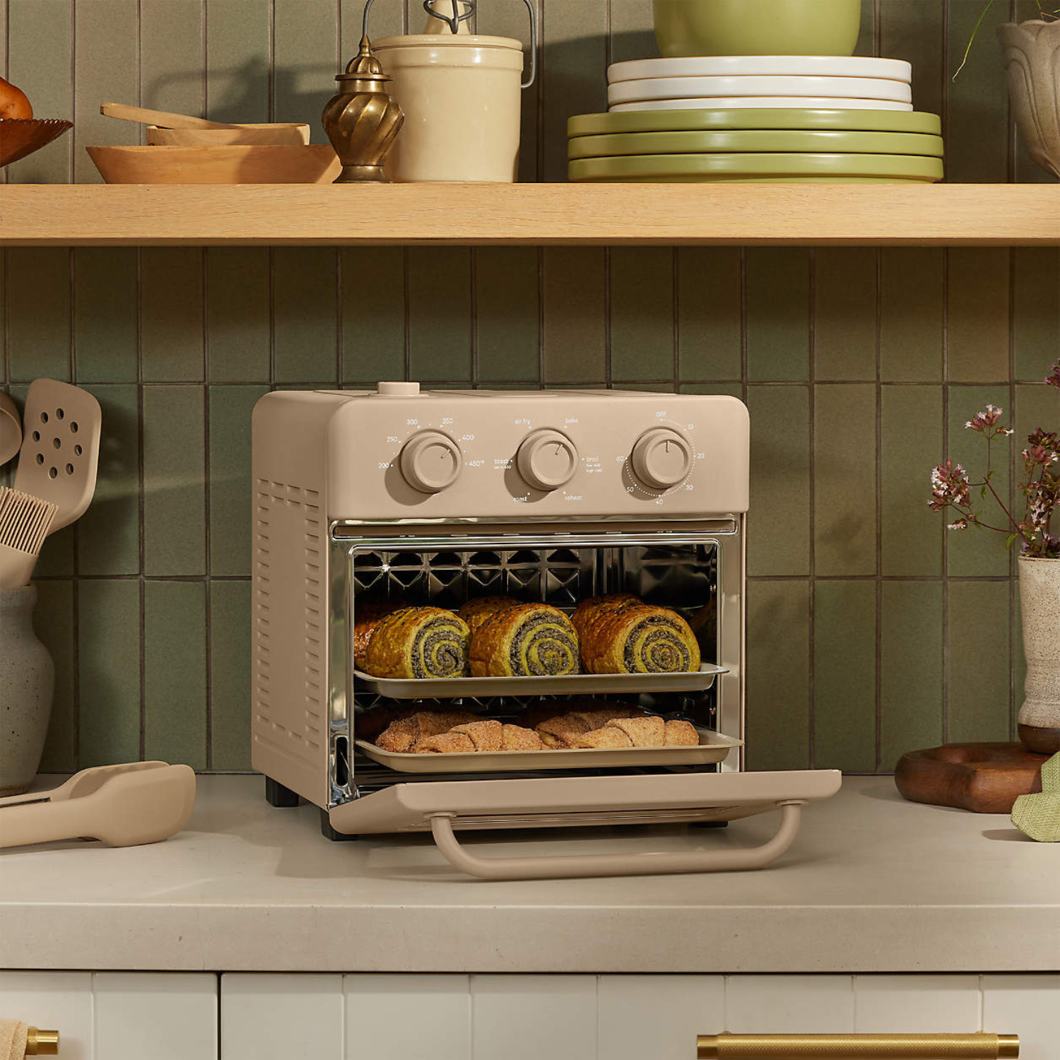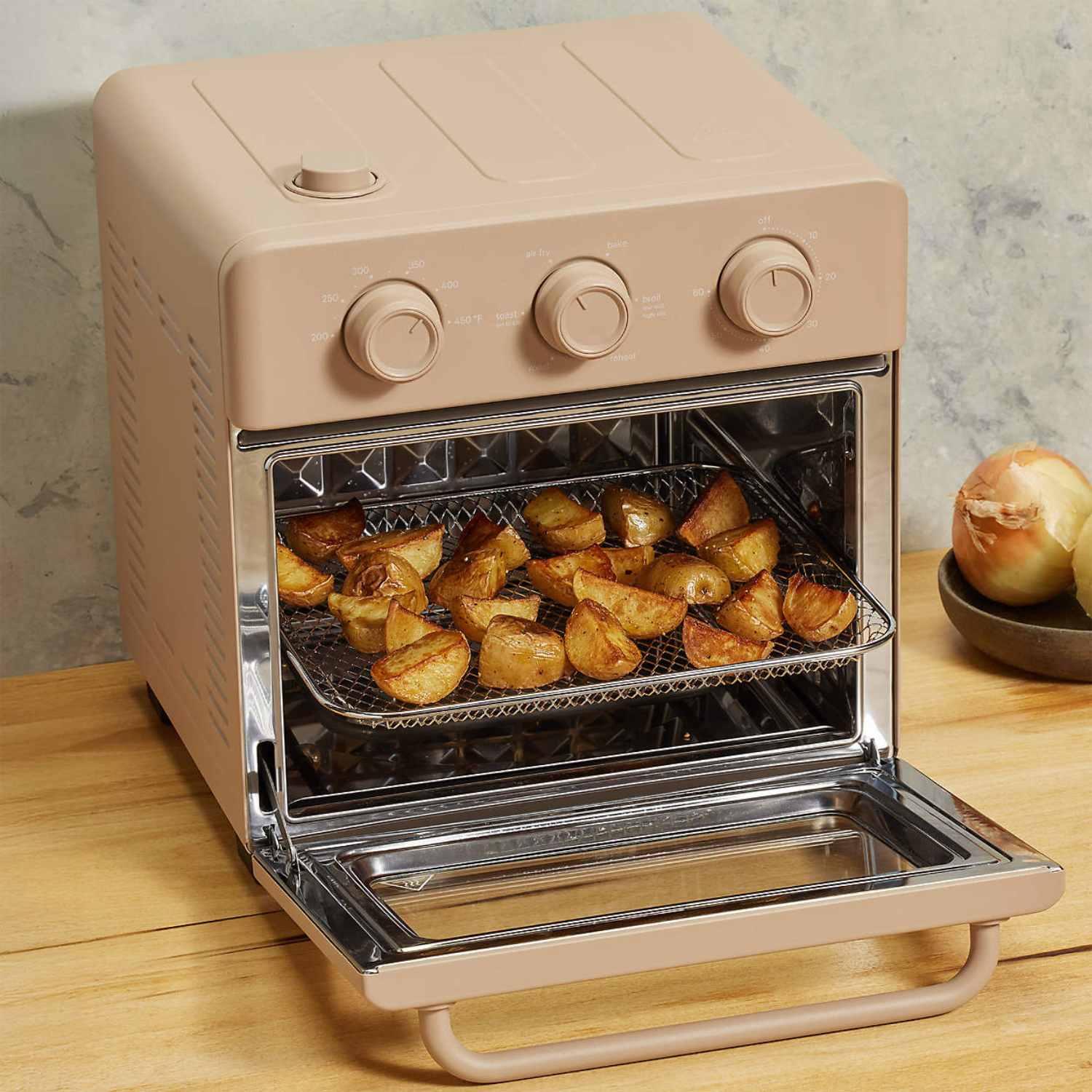 A conveniently-sized, countertop-worthy appliance that can air fry, bake, roast, toast, reheat, and broil – all with our steam infusion technology for crispy exteriors and soft, moist interiors.