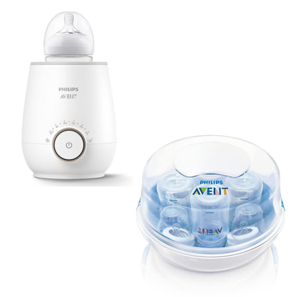 Microwave Steam Sterilizer: With its lightweight and compact design, this microwave steam sterilizer from Philips AVENT is perfect for use in and out of the home. It sterilizes up to four bottles in as little as two minutes and keeps them sterile for up to 24 hours when the lid is unopened. Features a size that fits most microwaves and side grips that allow for safe and easy handling.; Fast Bottle Warmer: Prepare perfectly warmed feeds in minutes with a bottle warmer that manages the temperature for you. The smart temperature control prevents milk and baby food from overheating and adjusts the heating pattern for fast warming. Smart temperature control warms to the ideal temperature. Set the milk volume, press start, and let the smart temperature control take care of the rest for you. It detects the milk’s initial temperature and quickly warms it to the ideal temperature and keeps it there for up to 60 minutes. Defrost function for frozen milk and baby food containers. Like to keep the freezer stocked with extra feeds? The bottle warmer quickly defrosts milk and baby food containers too. Warms up baby food containers as well as milk. When your little one is ready to graduate to solids, the bottle warmer also defrosts and warms baby food containers. Easy to clean Designed with just one piece so cleaning is easy and you can enjoy more time with your little one. Maintains the ideal temperature for up to 60 minutes Our bottle warmer maintains the perfect temperature for up to 60 minutes, just in case you need more flexibility around mealtime. Compatible with most leading bottle and baby food jar brands Designed to fit your baby’s favorite Philips Avent bottles and most leading baby bottle and baby food jar brands.