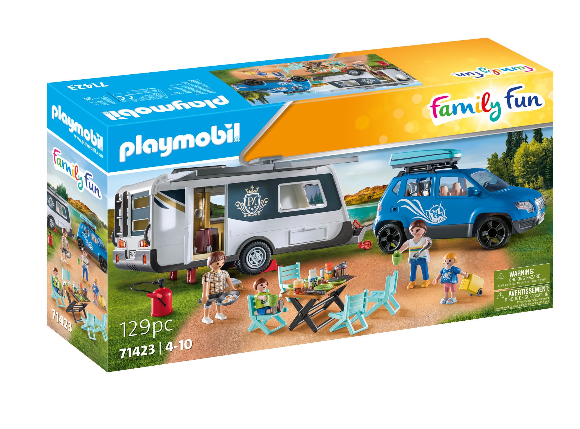 Off to fun camping adventures within the caravan with car from PLAYMOBIL! This richly detailed toy set offers everything adventurous children need for great nature trips: a spacious caravan for the whole family, a car and extensive camping equipment. Couple the caravan to the car, get in and jet off to find the best spot for your camping holiday. Whether it’s a weekend getaway or a long road trip, this caravan is perfect for any journey.