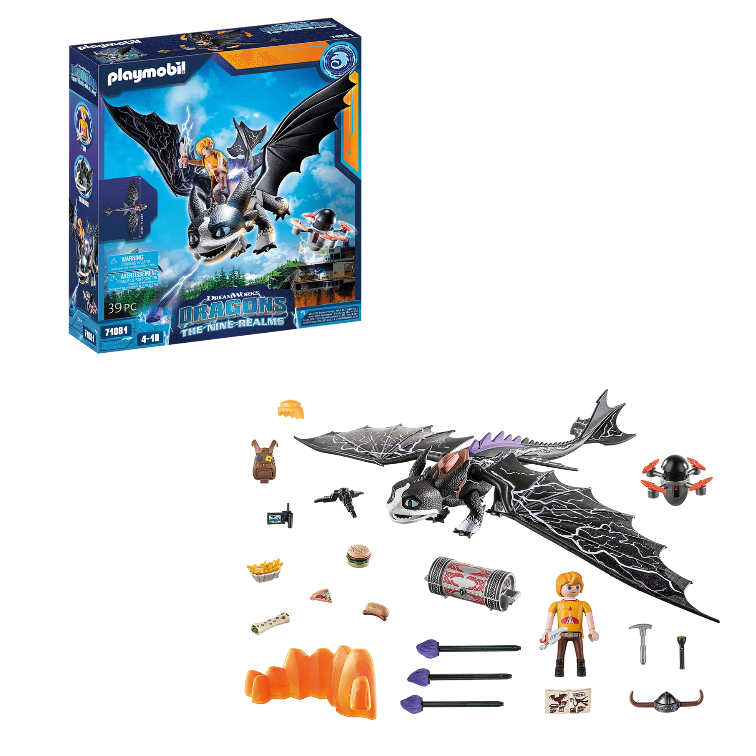 The set includes Dragons: The Nine Realms characters Tom Kullersen and his dragon Thunder with light module and shooting function, three arrows, a Viking helmet, a drone, a flashlight and other great extras.