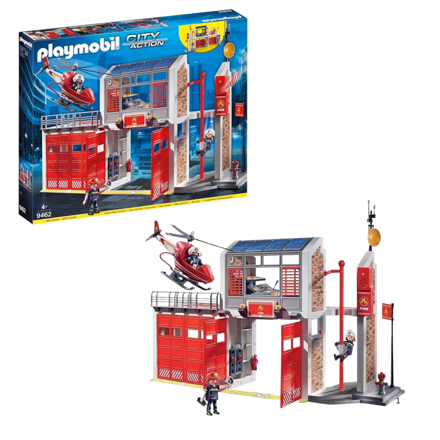 Setincludes sliding pole, fire alarm (2 x AAA batteries required), helicopter and helipad, as well as two garages for emergency fire vehicles.