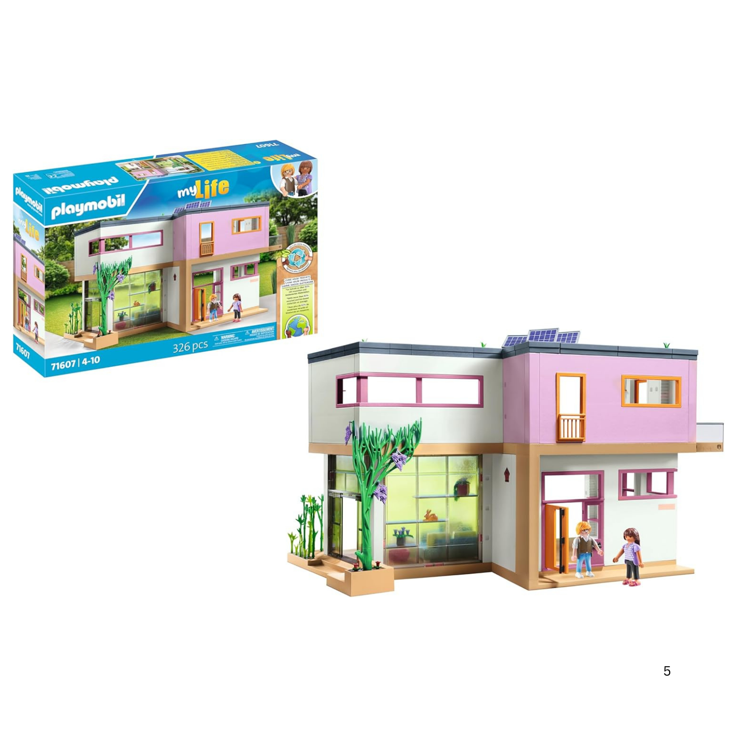 In the spacious house with conservatory, living dreams come true! The light-filled house in Bauhaus style offers plenty of space for playing and individual furnishing. The living room is the central space of the large house and comes fully equipped. With additional room sets from the Living House play world, the large living house can be complemented and redesigned at any time. A solar panel on the roof ensures environmentally friendly energy supply. The house can be expanded and redesigned with four room sets, allowing for endless creativity. With happy stickers for personalized decorating of the building and interior. All sets in the PLAYMOBIL Living House play world consist of over 80% recycled and bio-based materials on average.