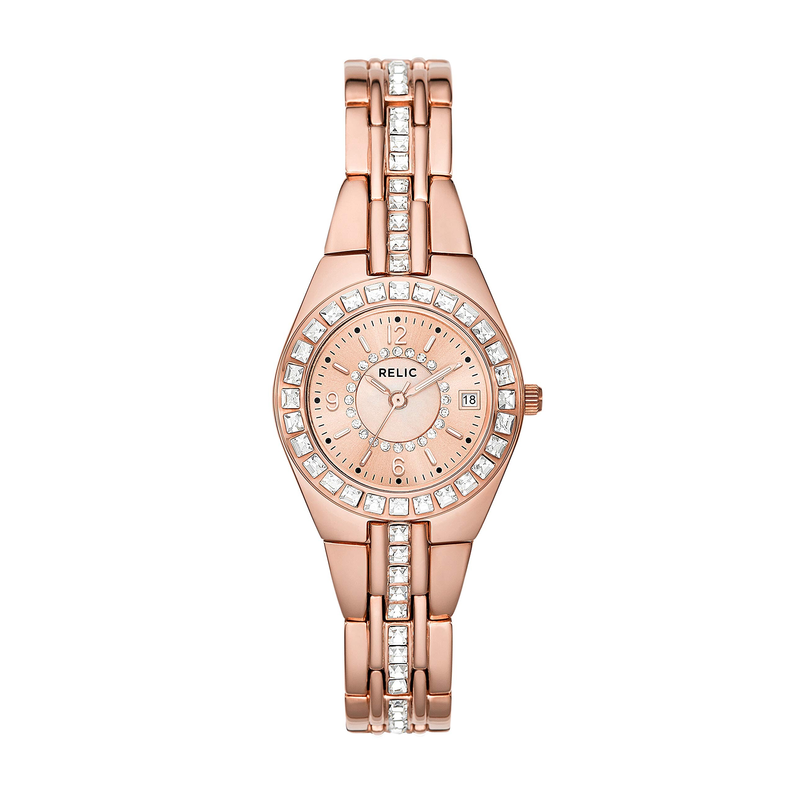Go casual chic with this crystal-accent watch that combines relaxed, modern styling with glamorous glitz. Features a luminous mother-of-pearl dial, date display and sweeping second hand.