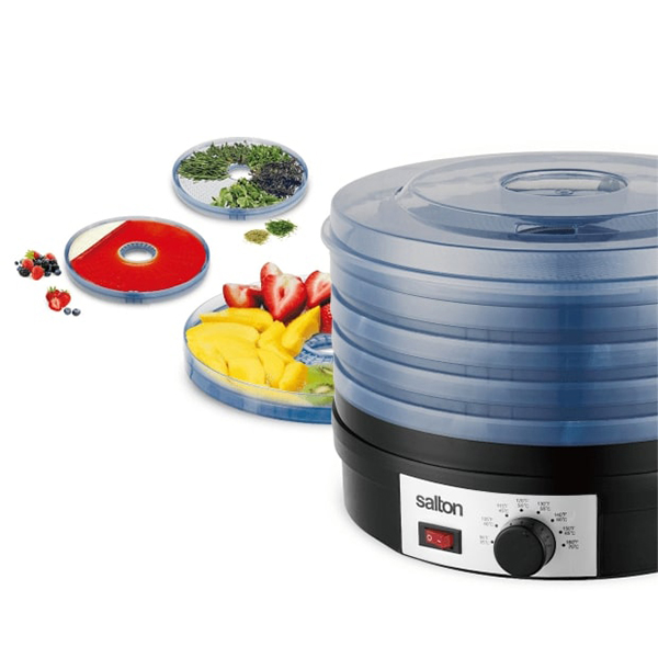 The easy and economical way for drying fruits for snacks, vegetables and herbs for soups, meat for jerky, bread for croutons and flowers for arrangements or potpourri! . The Salton Food Dehydrator has adjustable heat control and a quiet motor which circulates the air, eliminating the need to rotate trays.