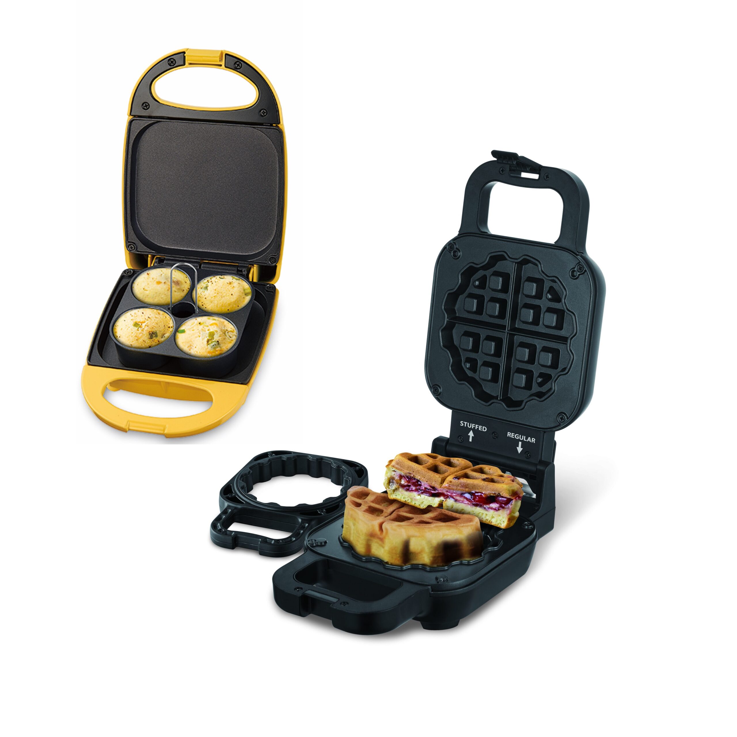 Welcome to waffles reimagined with the Salton Stuffed Waffle Maker. Create delicious, sweet or savory thick Belgian waffles with your favorite toppings stuffed inside. In four easy steps, you can achieve your own appetizing flavor combinations! Just add batter to the non-stick waffle iron, add toppings and more batter on top; cook and enjoy! . The Salton Stuffed Waffle Maker makes a 2” deep stuffed waffle. Alternatively, you can easily remove the waffle ring for regular 1” deep Belgian waffles. Transform your waffle experience with endless possibilities for batters and toppings alike! Create waffle meals for breakfast, lunch, or dinner. Make your favourite egg bite at home or take it to go with the Salton Egg Bite Maker. This unit presents a protein-packed option for home or on-the-go! Keto! Low Carb! Paleo! Cracking !. Gluten-Free! Accommodate your lifestyle with a healthy snack, ready in five minutes. Simply prepare your eggs, customize with your favourite toppings and cook. The removable egg tray is non-stick and easy to clean making this unit convenient for meal prep and batch-cooking. Whip up the perfect bite with the Salton Egg Bite Maker. Partnered with the Egg Farmers of Canada, the Salton Egg Bite Maker offers a versatile appliance that simplifies meal preparation. Get Cracking !